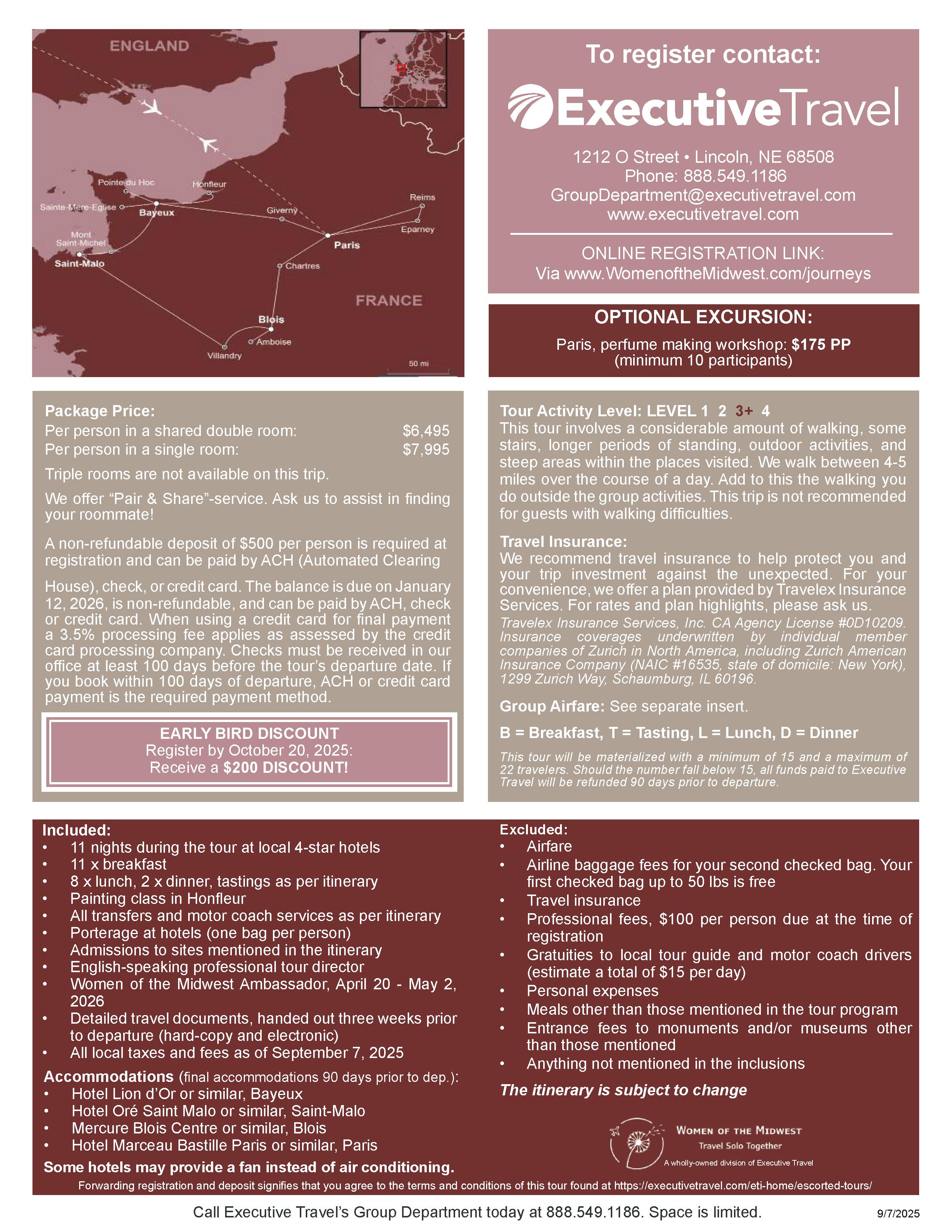 • If canceling a tour prior to full payment, the deposit and professional fees can be applied to a future Women of the Midwest tour taking off within twelve (12) months!