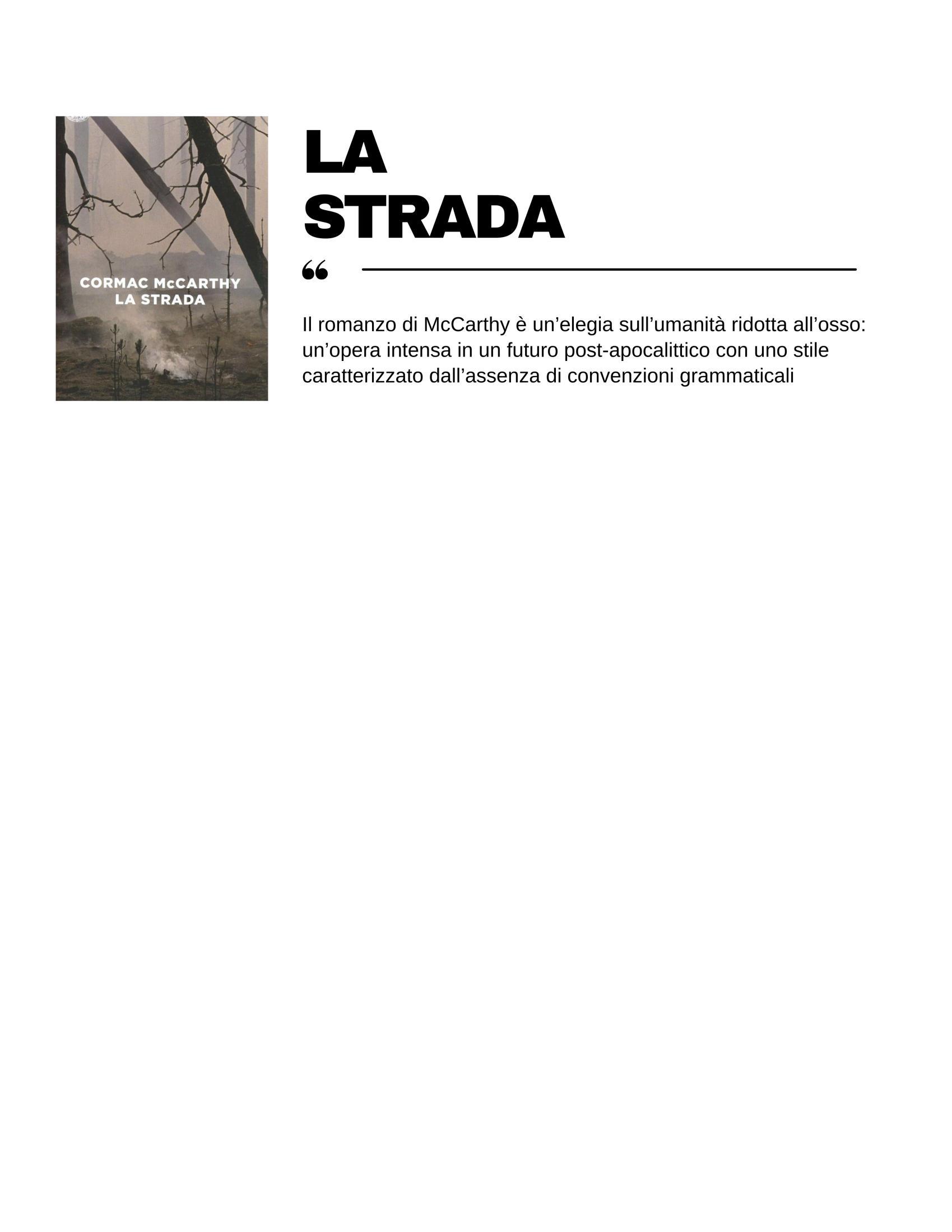 verso un futuro di speranza A colpire nel libro è lo stile dell’autore che simboleggia nel migliore dei modi il quadro post apocalittico. Addio alle convenzioni grammaticali, dialoghi senza virgolette ma anche una punteggiatura ridotta al minimo ed usata solo quando necessario. L’utilizzo di frasi brevi, secche ed esaustive sembra quasi una scelta per far percepire al lettore il respiro affannato dei protagonisti che camminano nel gelo, in cerca del sole. Sicuramente interessante è l’atmosfera che permea il libro Non viene spiegato, infatti, cosa abbia causato la catastrofe ma non un elemento, ma non importa ma quel che conta è il presente rappresentato dalla fame, il freddo e la minaccia costante dell'"altro" Una scrittura viva ed essenziale che rende questo un romanzo che colpisce per la sua capacità di emozionare senza mai cadere nel sentimentalismo Sicuramente è un romanzo duro, a tratti angosciante, ma sotto sotto ancora umano. McCarthy descrive scene di una crudeltà inaudita ma lo fa con una precisione chirurgica che impedisce di distogliere lo sguardo e che lascia il segno. In un contesto distrutto e di totale annientamento, spicca il vero cuore dell’opera ovvero l’amore paterno In conclusione, La strada è un libro che lascia il segno, consigliato a chi ama le storie intense e riflessive. Nel complesso questo libro non è sicuramente una lettura facile, forse nemmeno agevole ma è sicuramente una di quelle che lasciano il segno e restano nella memoria.