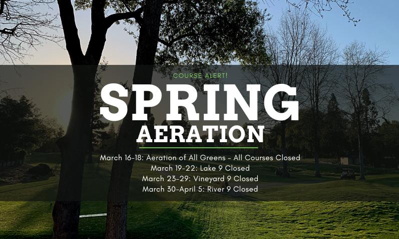Spring aeration of greens, tees, and fairways is scheduled to begin the third week of March. This is one of the most important agronomic practices we perform each year and plays a critical role in maintaining long-term turf health and playability.