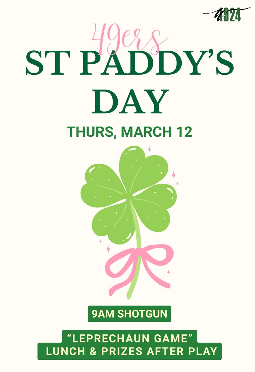 DUCKHORN WINE DINNER 6pm 19 SPRING AERATIONLAKE CLOSED LUNCH MENU 11am-5pm / BAR MENU 3-6pm Bootcamp 5:45am 49ers 9am 18-Hole Ladies 9am CVTLC TEAM Tennis Drop In 9:30am Strength Training 5pm Zumba 6:15pm 20 SPRING AERATIONLAKE CLOSED LUNCH MENU 11am-5pm / BAR MENU 3-5pm / DINNER 5-8pm Yogalates 9:30am ST PADDY’S ROUND ROBIN