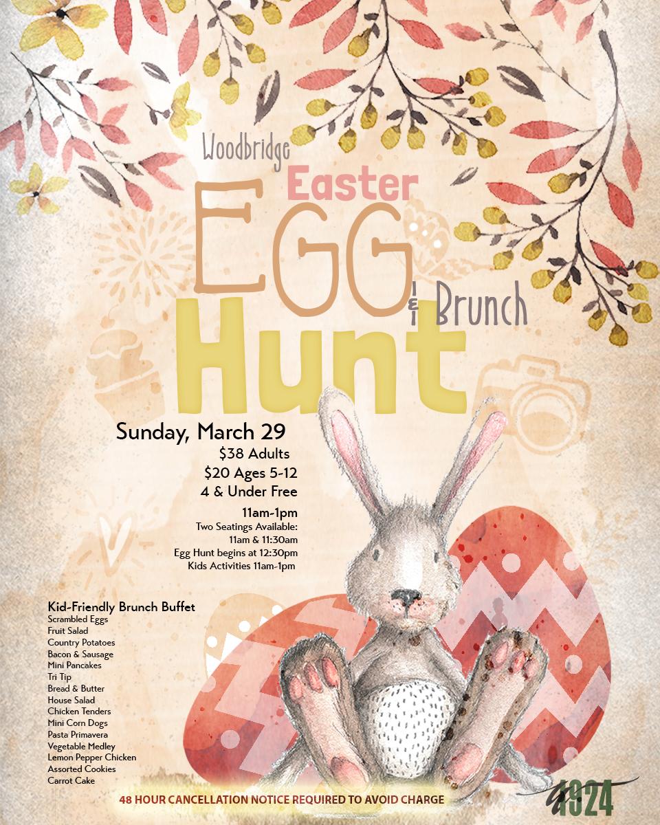 A family favorite with two seating times (11:00 and 11:30 AM), kids activities from 11:00–1:00, and the egg hunt starting at 12:30 PM. Pricing is $38 adults, $20 ages 5–12, and 4 & under free (48-hour cancellation notice required to avoid charge).