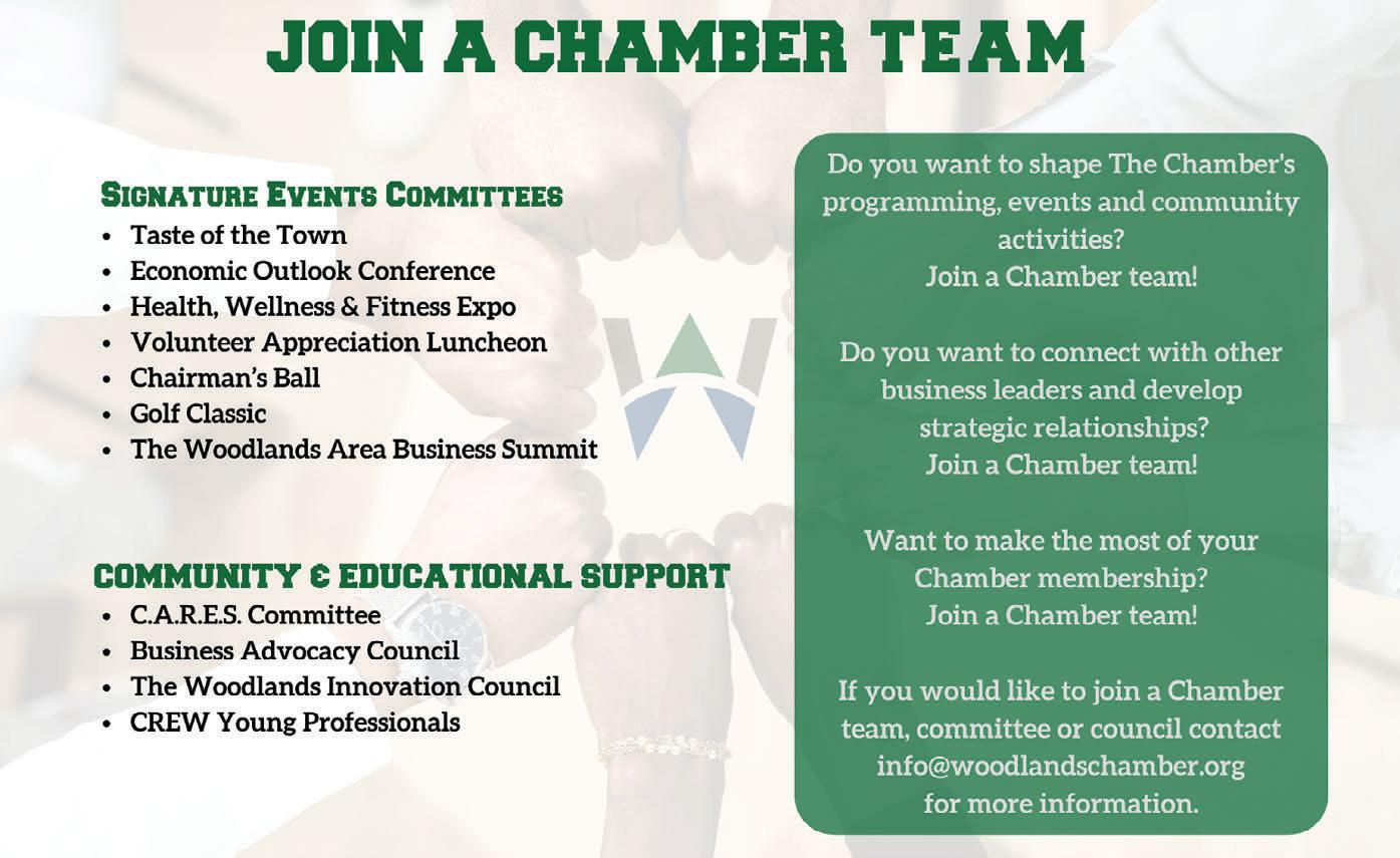 We encourage you to take full advantage of these opportunities. Engage with fellow members, share your ideas, and continue to be an active part of shaping the future of our community. The relationships you build and the insights you gain will not only enhance your company, but also contribute to the continued success of The Woodlands area as a whole.