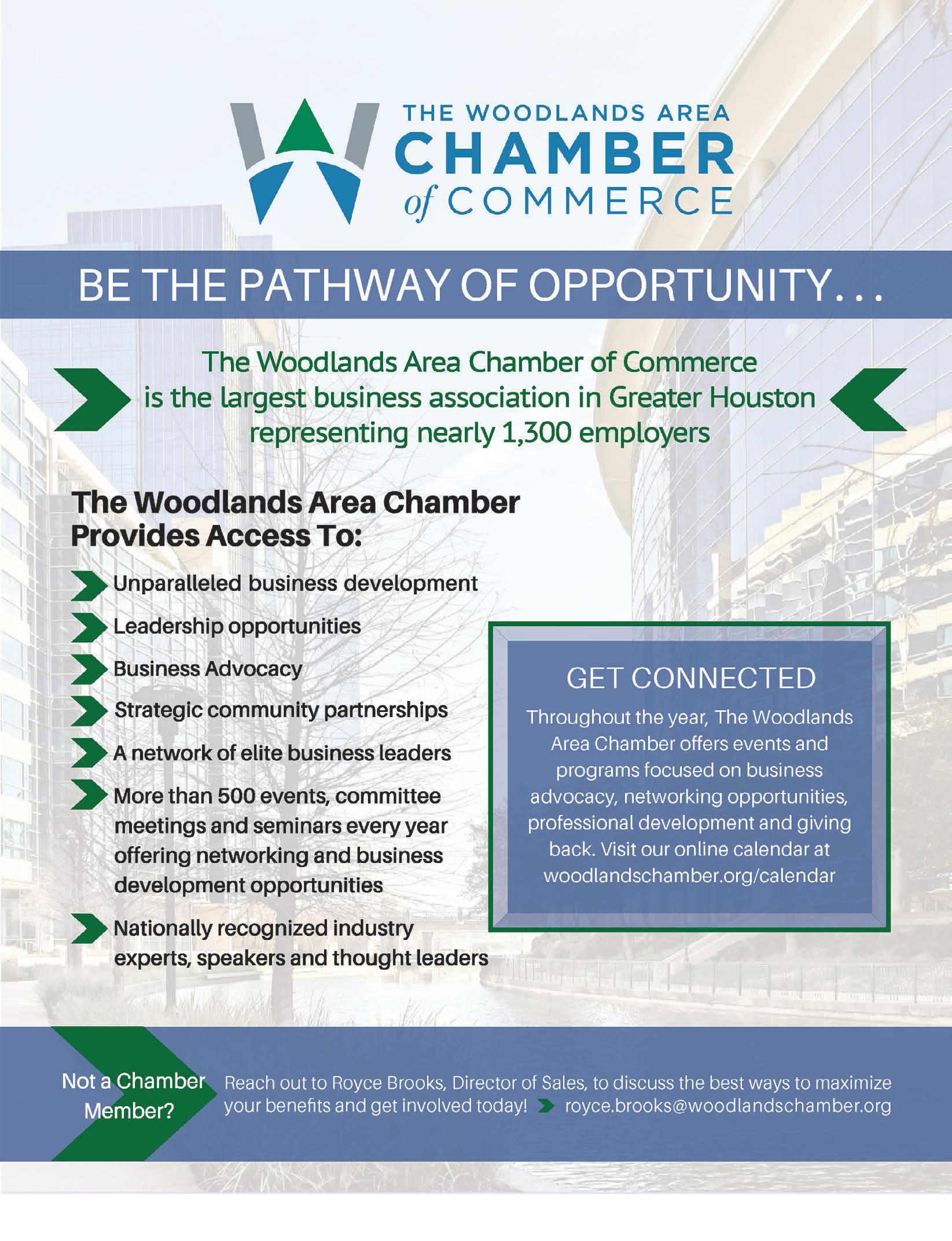 At The Woodlands Area Chamber of Commerce, our mission is simple yet powerful: to serve as the Pathway to Opportunity for our member businesses and our community. As the voice of the business community, we are committed to fostering a vibrant, dynamic environment where businesses of all sizes can connect, grow and thrive.