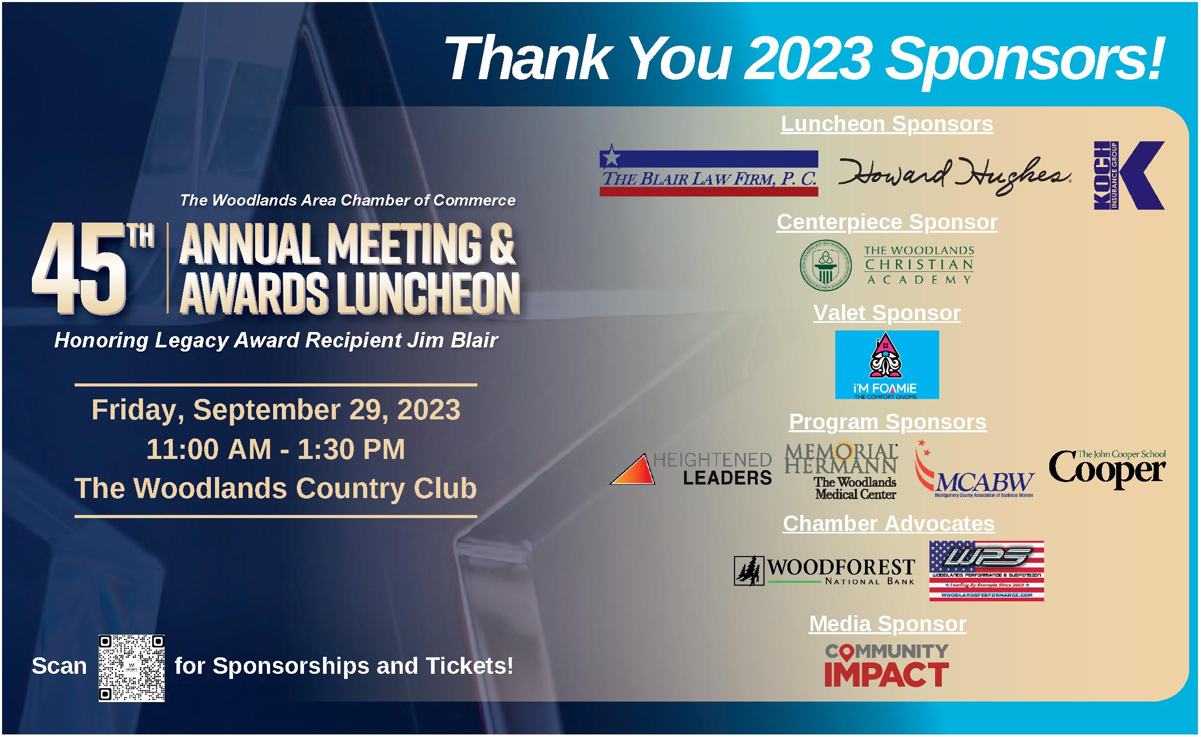 After having the opportunity to thank our outgoing Chairman, Jim Carman, at our recent Chairman’s Ball, we are now running full steam ahead into this new Chamber year, beginning with our Annual Meeting & Awards Luncheon and then continuing on into the fall with a host of exciting events, including our Annual Golf Classic and Business Summit. From there, we will kick off 2024 with Taste of the Town, and before long, we will be welcoming you to the premier business event in The Woodlands, our Economic Outlook Conference.