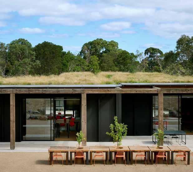 At the crest of Woodleigh’s Senior Campus, the Futures Studio sits quietly among native grasses, its green roof blending into the landscape. From a distance, it could be mistaken for a modern pavilion. Up close, it reveals its intent: walls lined with insulating straw panels, timber salvaged from St Kilda pier, acoustic baffles woven from discarded textiles. Every choice whispers the same idea – nothing here is wasted. Even the building itself is a lesson.