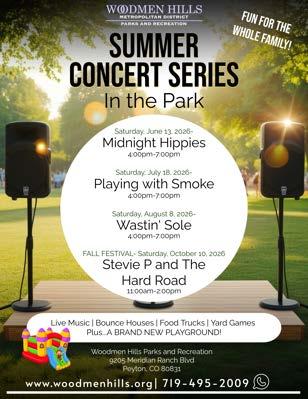 TheSummerConcertSeriesintheParkisoneof themostpopularcommunityeventshostedby WoodmenHillsMetropolitanDistrictParksand Recreation—andforgoodreason!Joinusforfour incredibleconcertsfilledwithlivemusic,food trucks,inflatables,yardgames,andfunforall ages.Bringyourlawnchairs,gatheryourfriends andneighbors,andenjoyunforgettableevenings ofmusicandcommunity.Theseconcertsarethe perfectwaytocelebratesummer,make memories,andexperienceeverythingWoodmen Hillshastooffer.