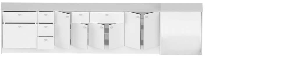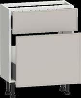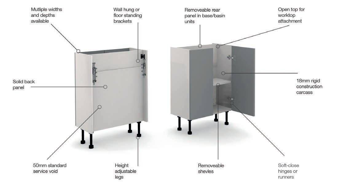 Carcasses All carcasses and fascias are pre-drilled and marked for fittings, with fully adjustable all-steel soft-close hinges on doors and soft-close drawer runners featuring four-way fascia adjustment. Carcasses are supplied with hinges, wall-fix brackets, and fittings; base units include adjustable legs and plinth fittings.