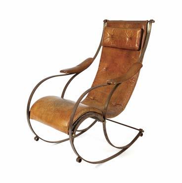 A steel and leather rocking chair, circa 1880 retailed by R.W. Winfield & Co. 107cm high, 85cm long (approx.), 64cm wide.