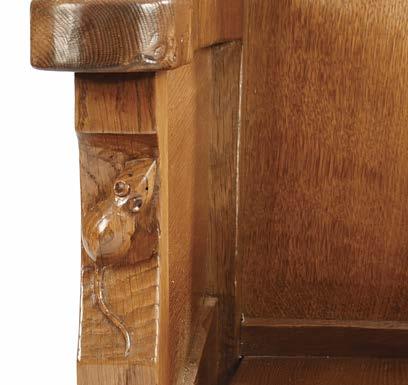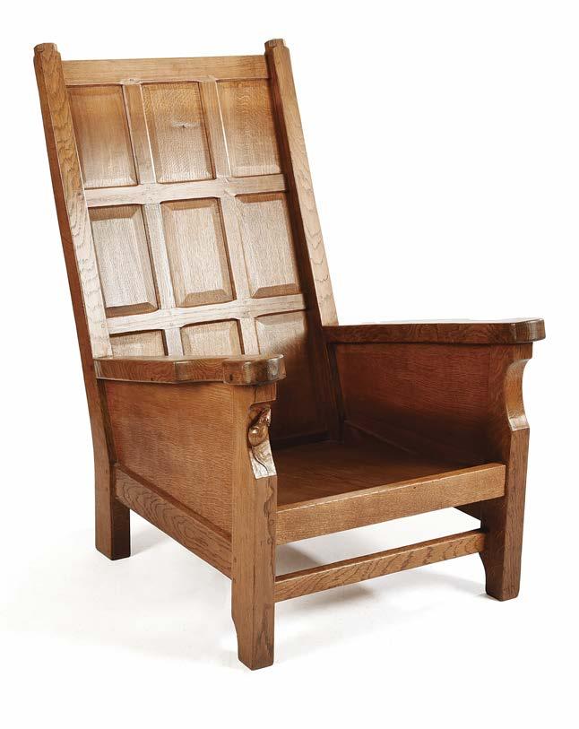 A rare Mouseman armchair, circa 1930 oak, with panelled back and seat and shaped arms and front stretcher, with leather cushions carved mouse signature 104cm high, 66cm wide, 74cm deep.