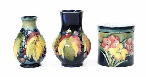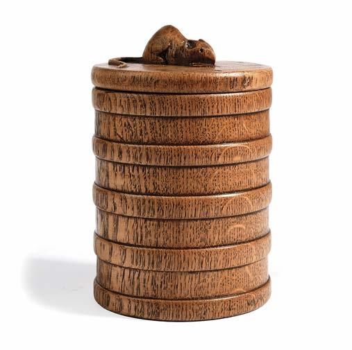 A Mouseman jar and cover, circa 1940 oak, cylindrical form with raised horizontal bands carved mouse signature 18cm high (2).