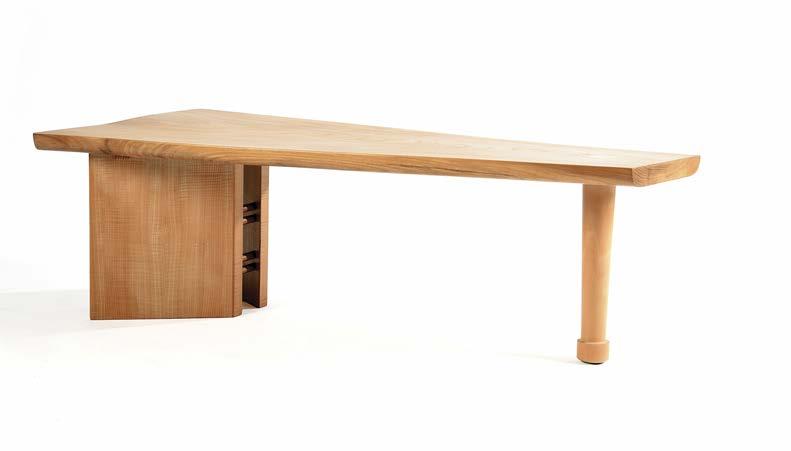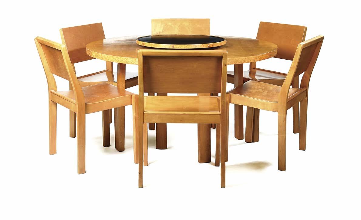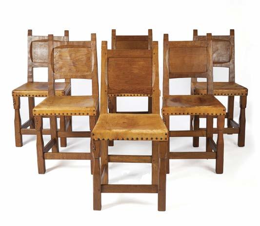 A Gnomeman dining table and six chairs the table with an octagonal top with an adzed surface, raised on a cruciform base the chairs with leather seats and carved supports the table 135cm wide, 74cm high; the chairs 87cm high, 40cm wide, 39cm deep (7).