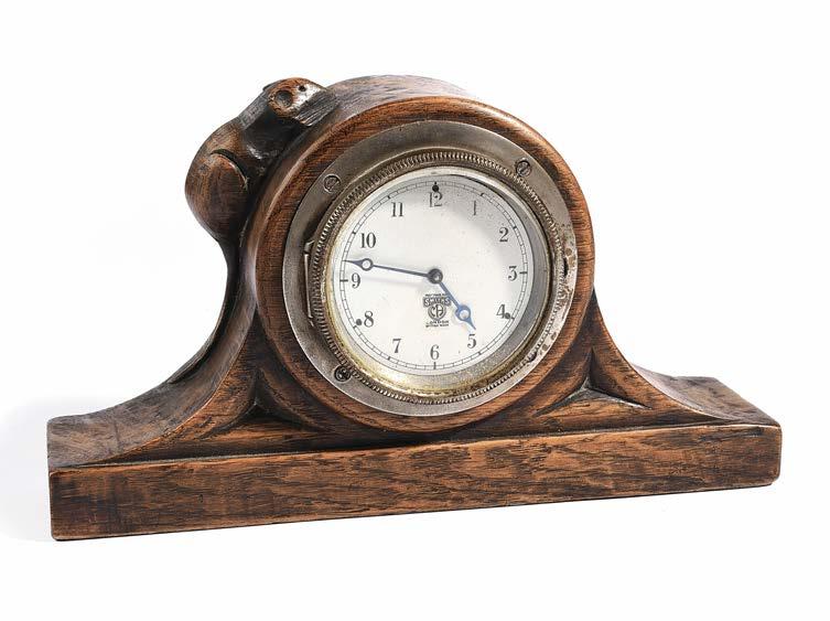 A Mouseman mantle clock, circa 1940 oak, the case with triangular carving set with a Smiths MA car clock, serial number H5138