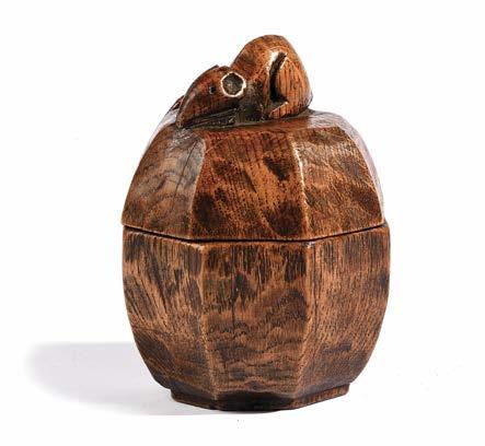 A Mouseman powder box and cover, circa 1940 oak, octagonal form with an adzed surface carved mouse signature 10cm high (2).