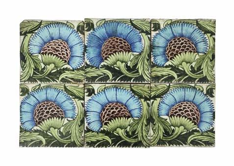 Six BBB pottery tiles, circa 1890 decorated in blue and green, showing carnations impressed Sands Ends mark to the reverse each 15 x 15.5cm (6).