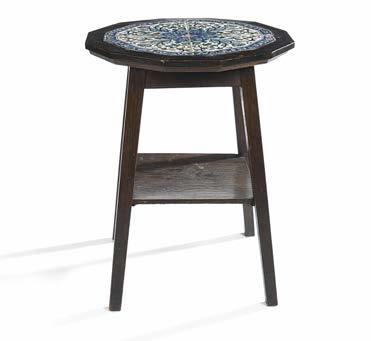 An oak occasional table with an inset tile top, circa 1900 the four Kutahya/Iznik tiles decorated in blue, white, green, and black 65cm high, 52cm wide.