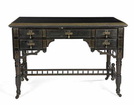 An ebonised and brass writing desk, circa 1880 with four short and one long drawer beneath a rectangular top, over turned and inlaid legs and stretcher 72cm high, 107wide, 61cm deep.