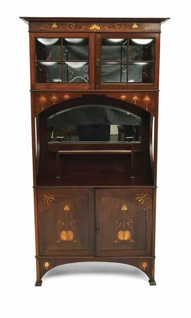 An Art Nouveau cabinet, circa 1900 marquetry inlaid in brass and copper with a frieze of stylised flower heads, above glazed doors and side panels with an open shelf below and with a mirror back 178cm high, 82cm wide, 35cm deep.