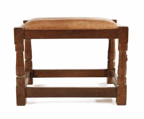 A Mouseman footstool, circa 1930 oak with dropin leather seat carved mouse signature to one leg 37cm high, 52cm wide, 38.5cm deep.