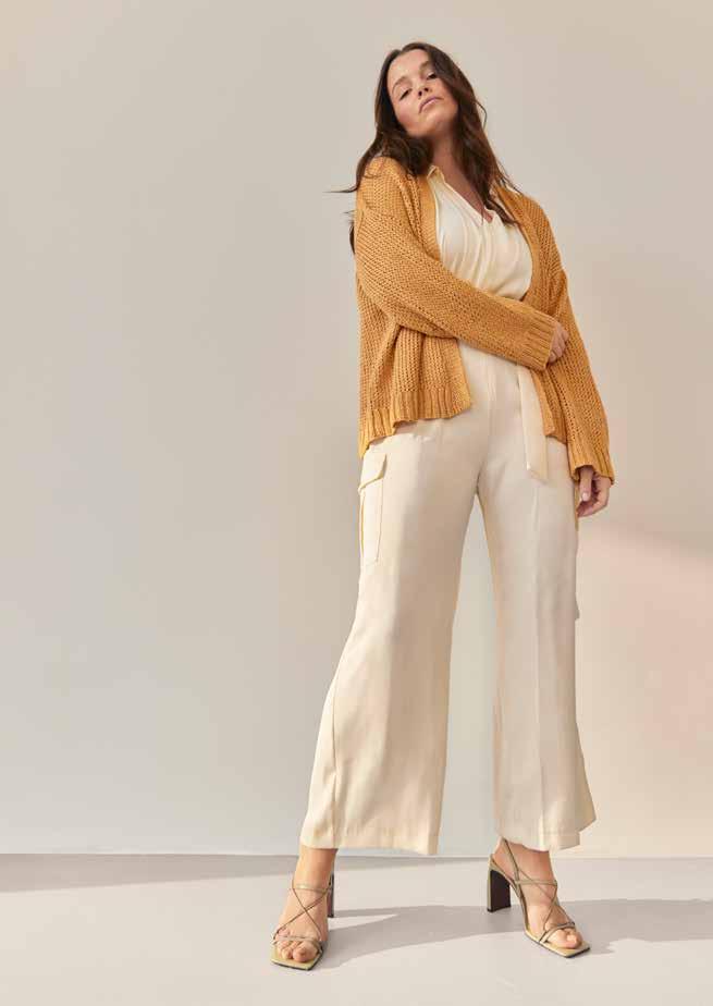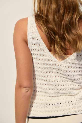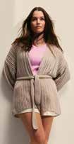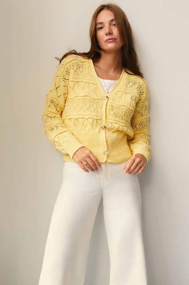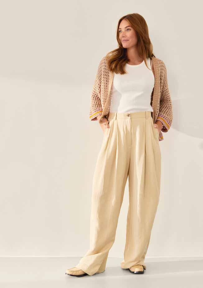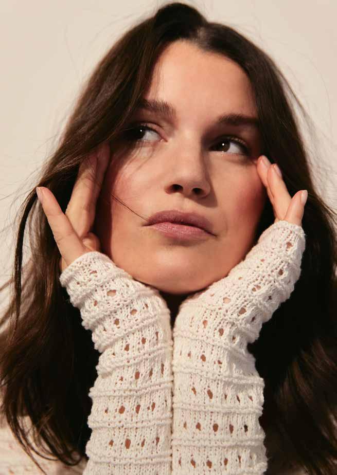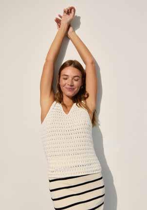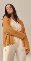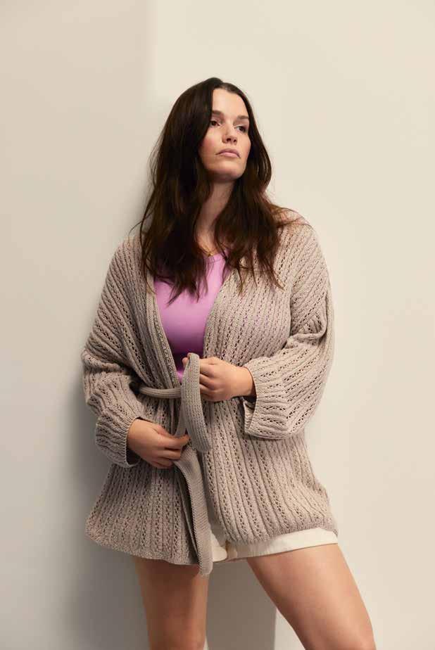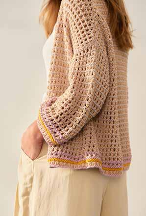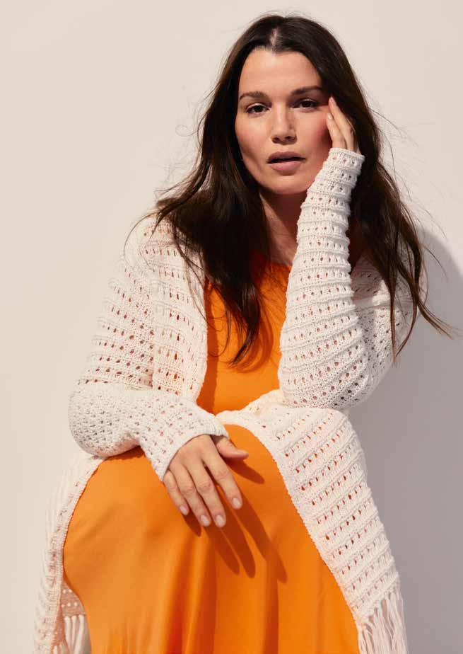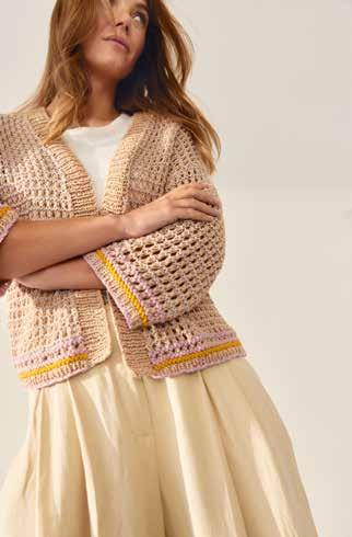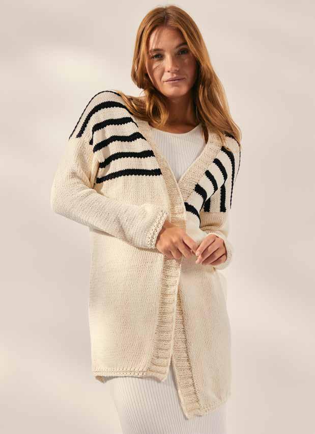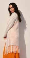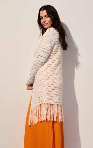 Fransen sorgen für Schwung, Allure und HippieAppeal. Hier schmücken sie einen weißen BaumwollLeinen-Cardigan aus Lochmuster und glatt rechts gestrickten Reihen. (Anleitung bis Größe 48/50). Das dazu passende Top finden Sie auf Seite 22.