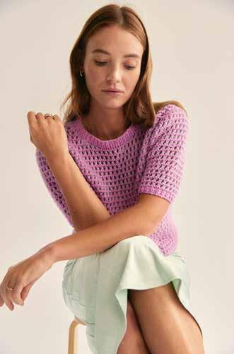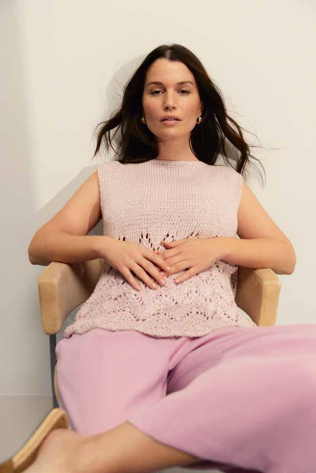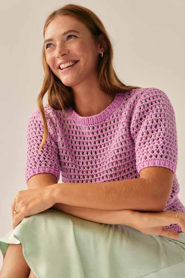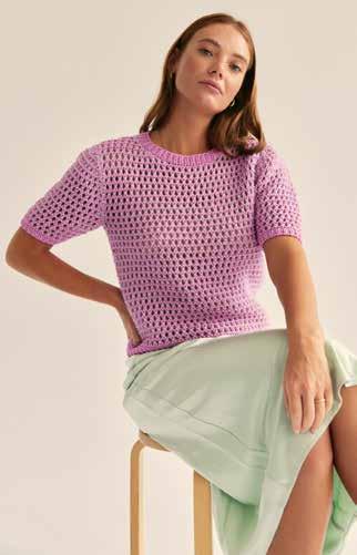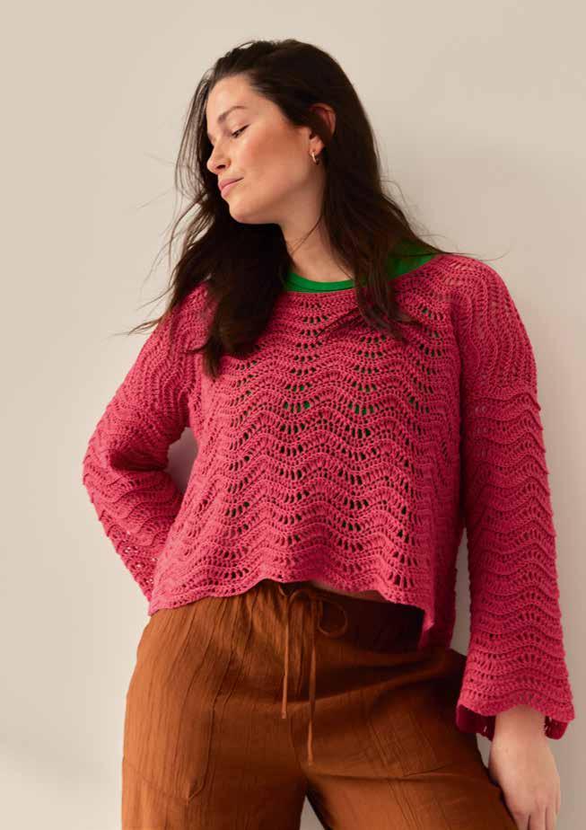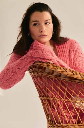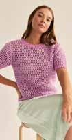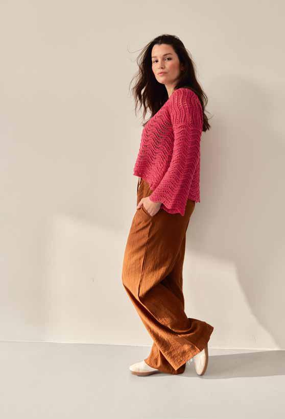 Linke Seite: Ein ungewöhnlicher Mix aus Curry und Fliederrosa macht diesen Klassiker interessant. Sein plastisches Halbpatentmuster wird durch voluminöse Garne betont. Diese Seite: Das pudrige Ajour-ZackenmusterTop besteht aus doppelt verstricktem Leinengarn. Praktisch: Durch den blickdichten Brustbereich lässt es sich unkompliziert stylen. Anleitung bis Größe 48/50.