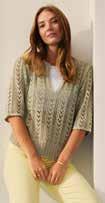 Linke Seite: Teegrünes, dezent genopptes Seidengarn (neu) verleiht diesem Ajour-Muster-Pulli natürlichen Charme und eine griffige Haptik. Tunika-Ausschnitt und Ärmelsäume werden im Wellenmuster umhäkelt. Diese Seite: Was von vorne wie ein klassischer Pullover aussieht, entzückt im Rücken mit einem Schlitz, der vom Nacken bis zur Taille reicht. Dazu gesellt sich ein zartes Grün, das Sommerbräune perfekt inszeniert.