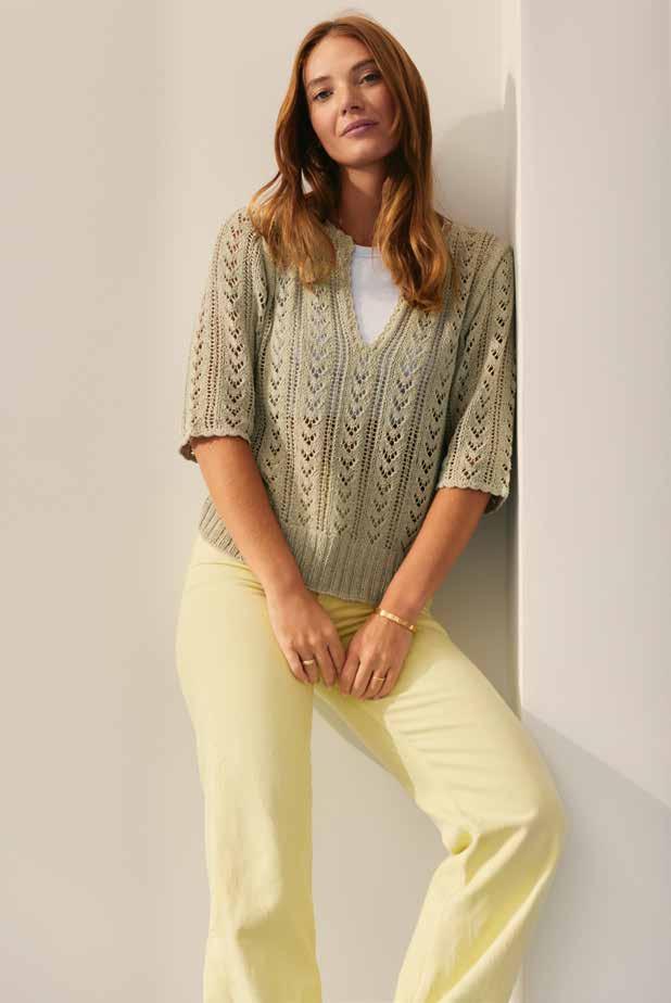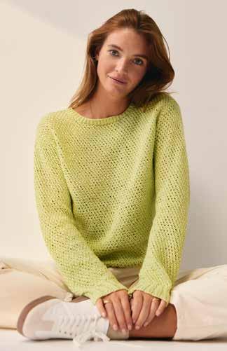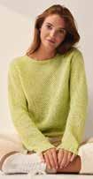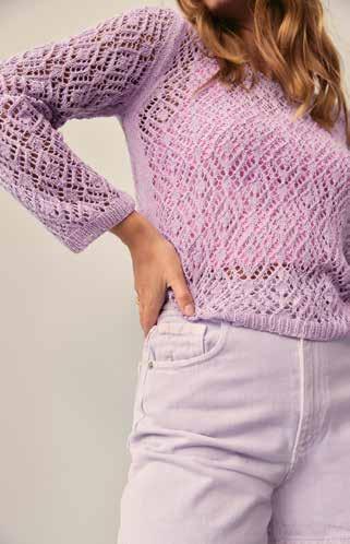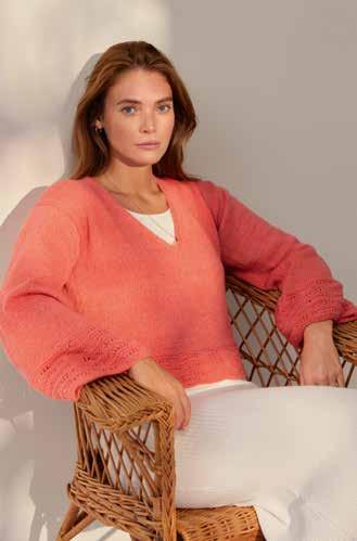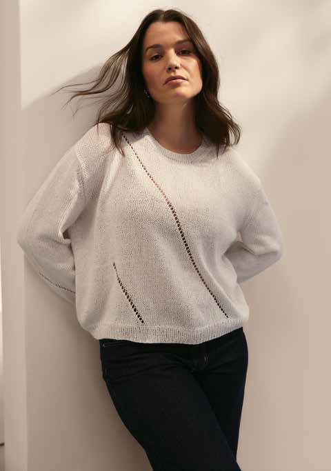 Lochmuster- und kraus gestrickte Reihen werden hier von zwei unterschiedlichen Garnen hervorgehoben. Eines davon ist hochelastisch und hält den luftigen Pulli in Form.