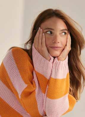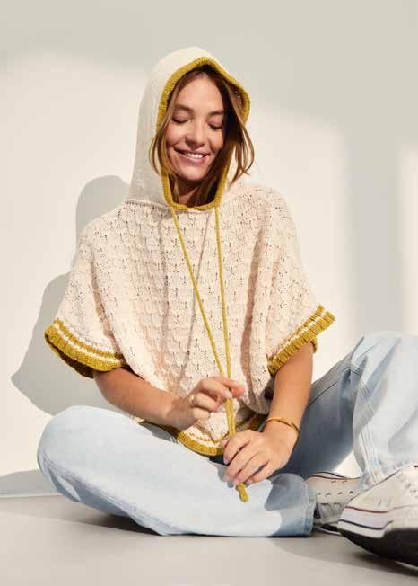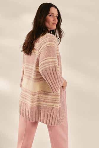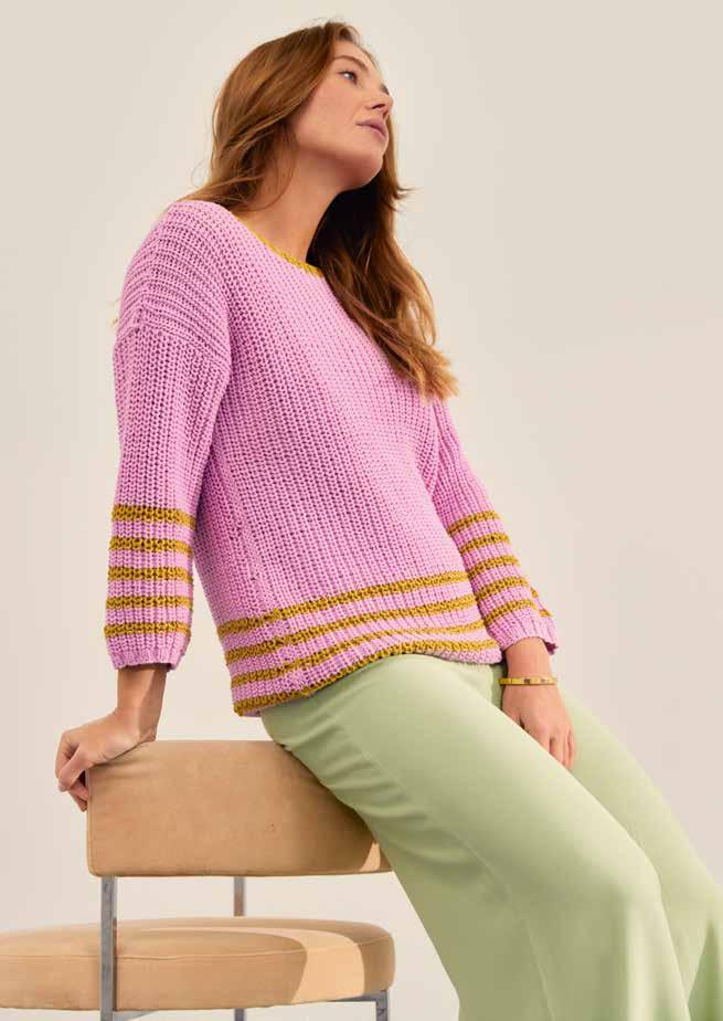 Bei diesem Modell sorgt eine voluminös-elastische Garnmischung für ein Plus an Struktur und Tragekomfort. Schöne Randerscheinung: gestreifte Säume in Goldgelb und Altrosa.