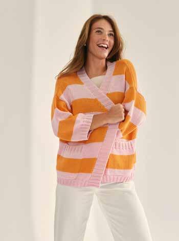 Ein rundes, weich gefülltes Garn (neu) macht den glatt rechts gestrickten Cardigan gleichzeitig leicht und voluminös. Sommerlich wirkt er durch die verkürzten Ärmel und Blockstreifen in Orange/Rosa.