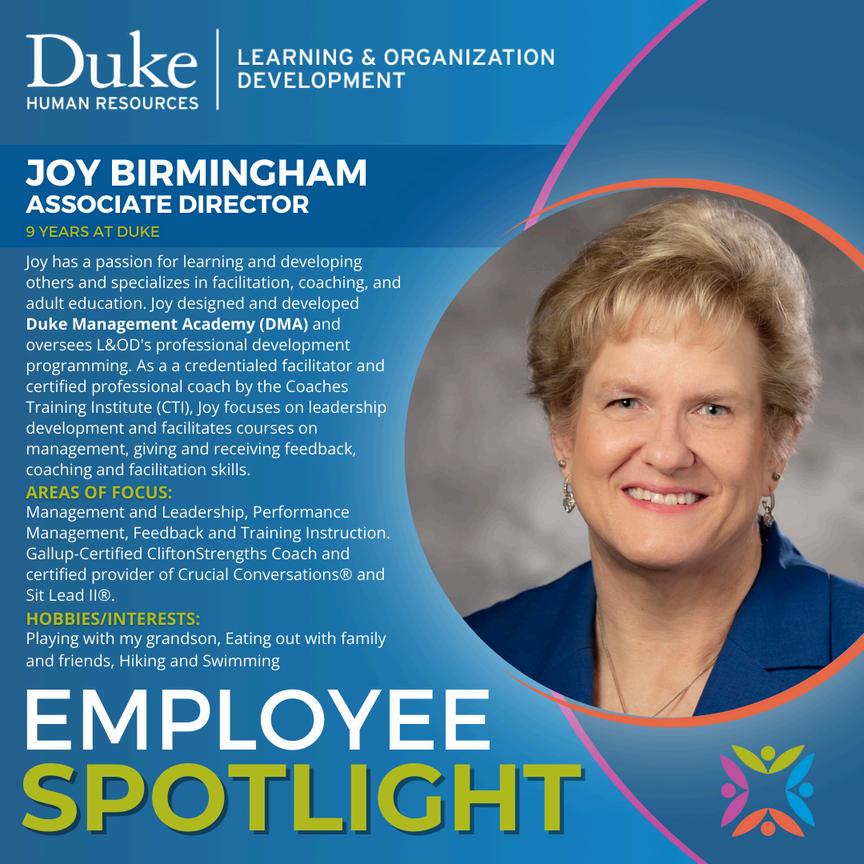 For more information, contact Joy Birmingham at joy.birmingham @ duke.edu.