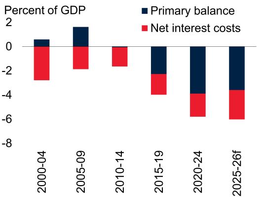 now due: fiscal deficits so far in the 2020s have averaged nearly 6 percent in developing economies, the highest level of this century. Interest costs alone account for about a third of the deficits. In low-income countries, the budget squeeze has been intensified by a drop in foreign aid, which finances a big share of critical needs such as health care. It should be no surprise that more than half of low-income countries are now either in debt distress or at high risk ofit.