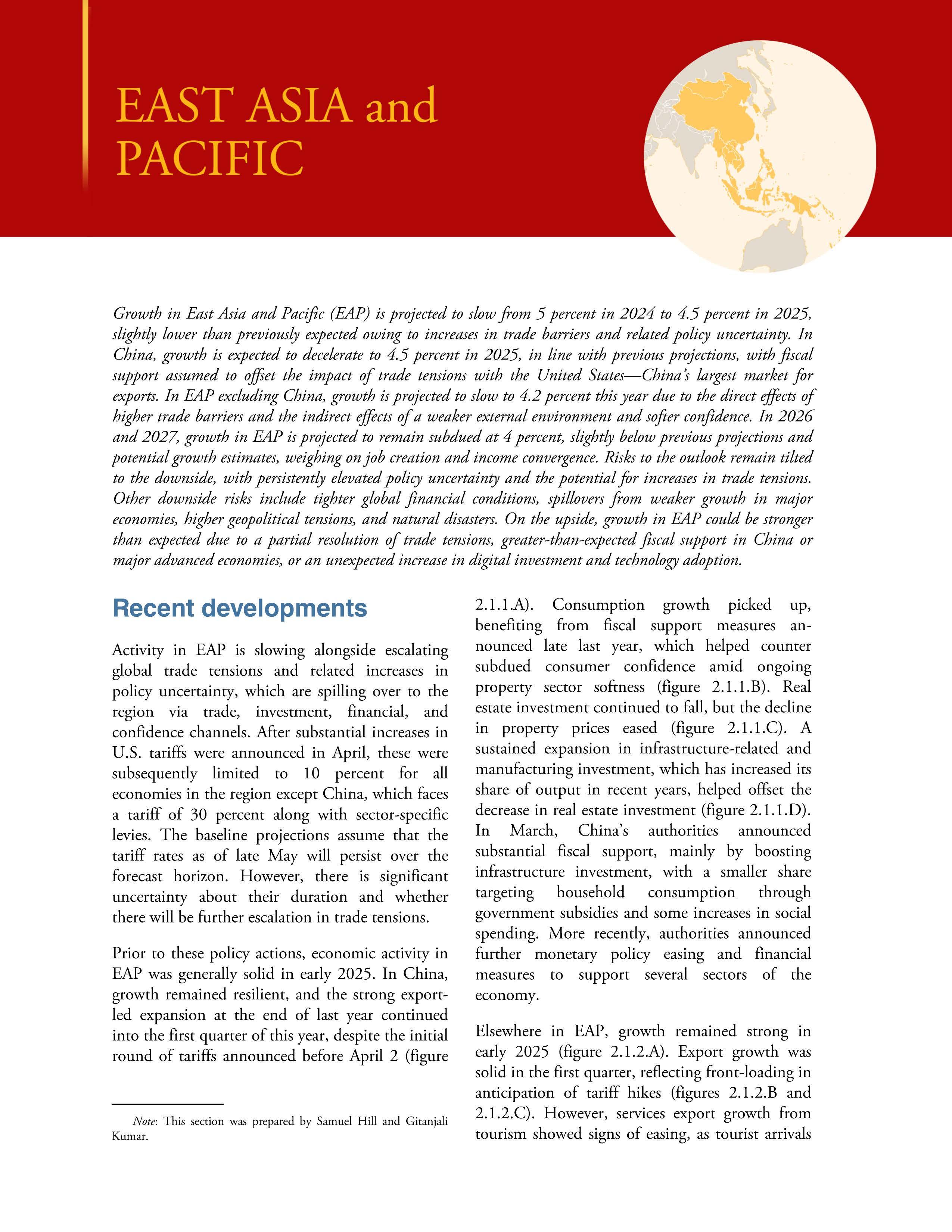 Regional Prospects. All EMDE regions face a challenging outlook amid the rise in trade tensions and heightened global uncertainty In 2025, growth is projected to slow in East Asia and Pacific as well as in Europe and Central Asia-both regions that are highly reliant on global trade-and, to a lesser extent, in South Asia. In Latin America and the Caribbean, growth is projected to be the lowest among