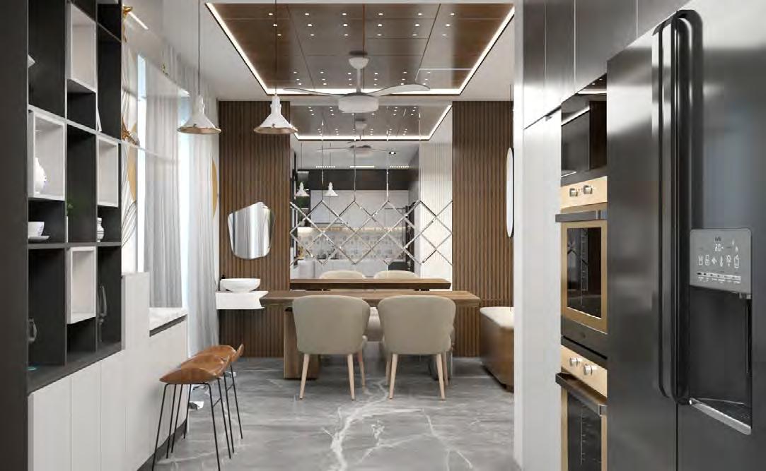 The responsibilites which came along this project included space planning , sections , false ceiling layout, bar counter, 3d modelimg , rendering.