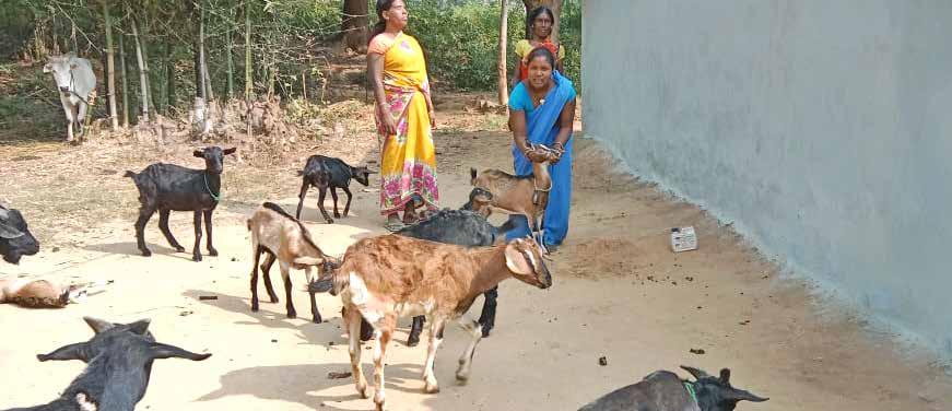 Somati is a trained Pashu Sakhi which literally translates to friend of the animals. She visits around 10 families that own livestock, mostly goats, and helps them with timely animal health check-up including vaccinations, deworming and first aid. She advises them about livestock hygiene, breeding and feeding, how to keep the farm clean and how to manage animal waste appropriately.