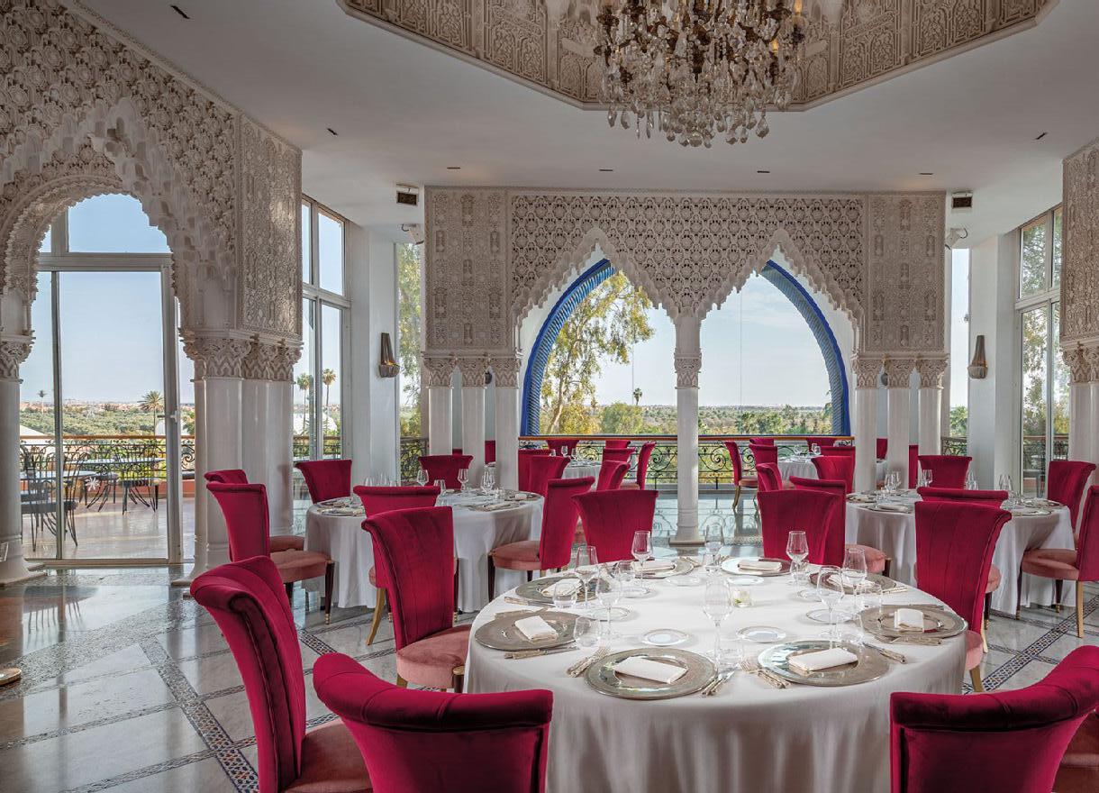 The gourmet restaurant features refined Oriental décor and overlooks the pools and gardens of the Palace. Here, guests can indulge in Moroccan delights crafted by renowned chef Fatéma Hal, who passionately introduces ancestral dishes such as Marouzia with Ras el Hanout, each recipe embodying techniques passed down through generations.