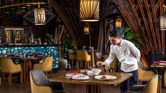 Meticulously designed with natural bamboo, the restaurant is anchored by a striking electric-blue fossilised coral bar that creates a dramatic yet sophisticated focal point. Inspired by the element of Fire, LAVA embodies warmth, energy, and transformation.