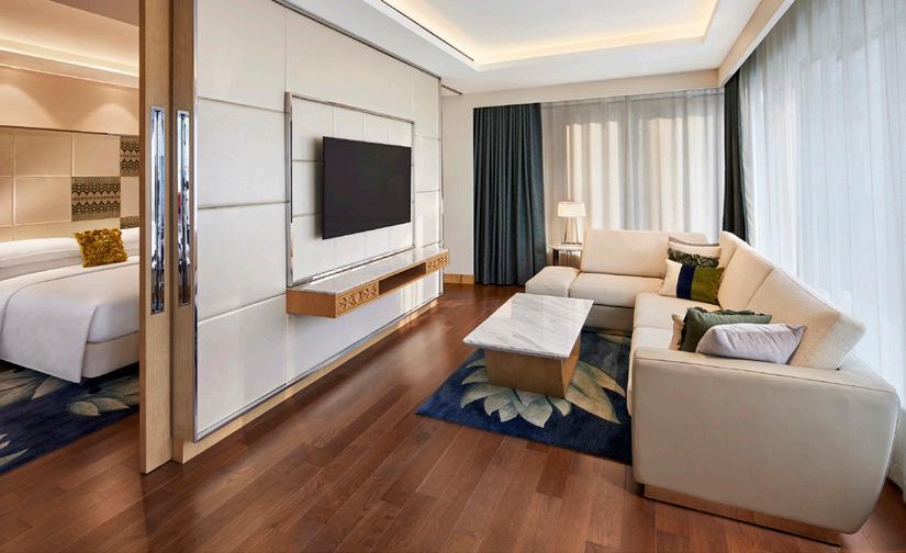The suites’ refreshed interiors feature relaxing earthy tones, with bespoke rattan and bamboo elements to evoke nature. Health and wellness facilities include four outdoor sky gardens, a 24-hour fitness centre and a 20m ionised-water swimming pool with a children’s area and Jacuzzi.