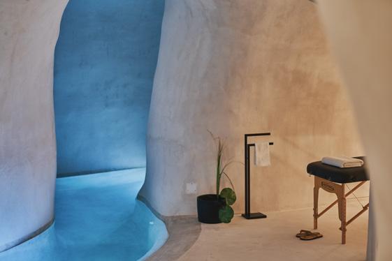 Only available for private use, the Wellness Cave Area is a divine retreat ready to captivate your senses. Enjoy the ultimate wellness VIP treatment as you immerse in Santorini’s natural volcanic waters in the 50 square meter pool within the illuminated rocky curves creating the feeling of a dream you are having with your eyes open wide.