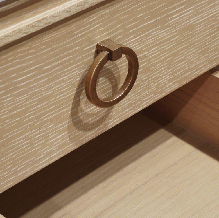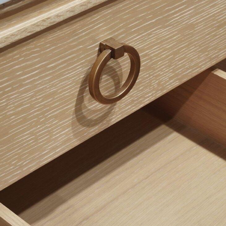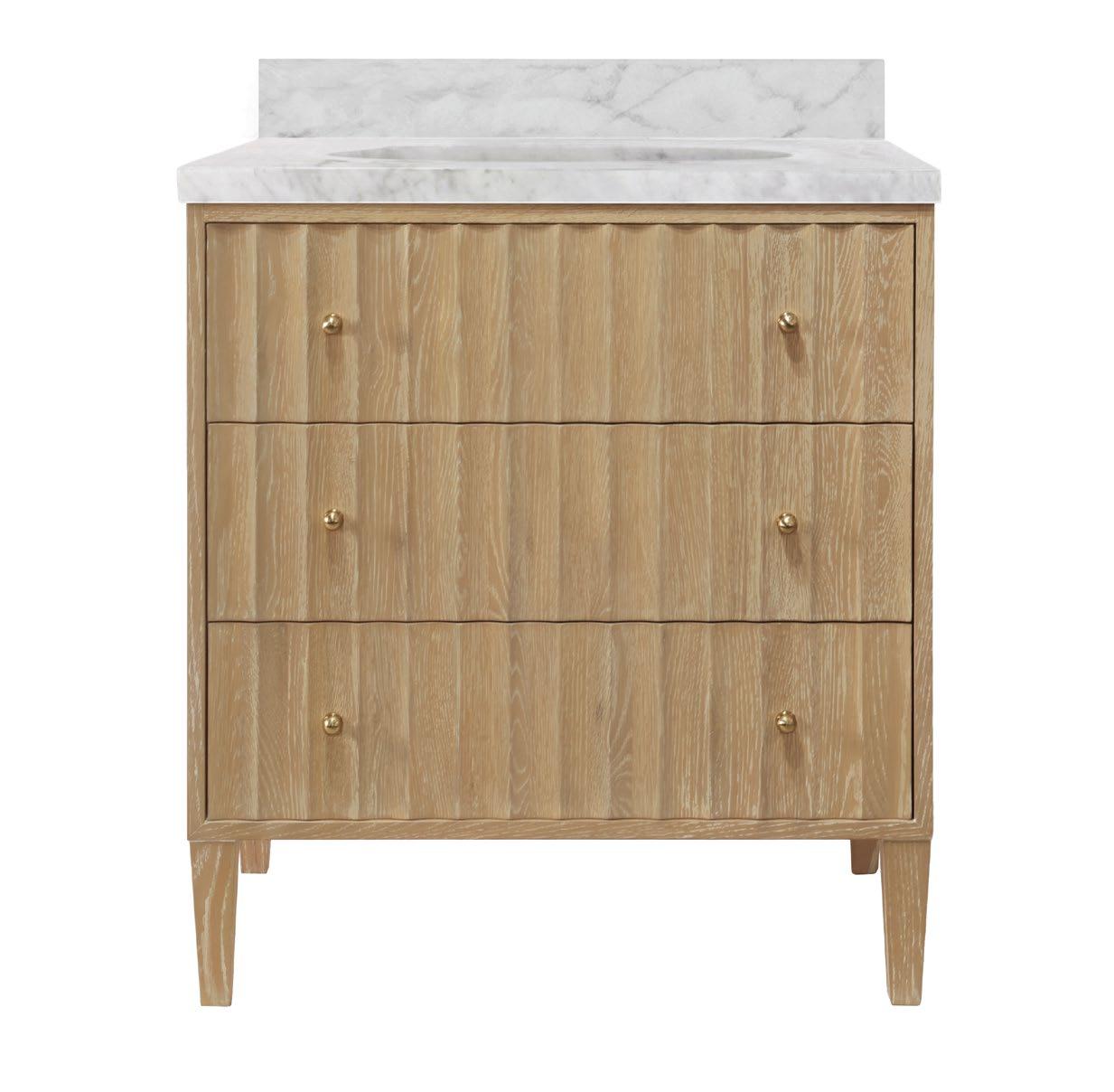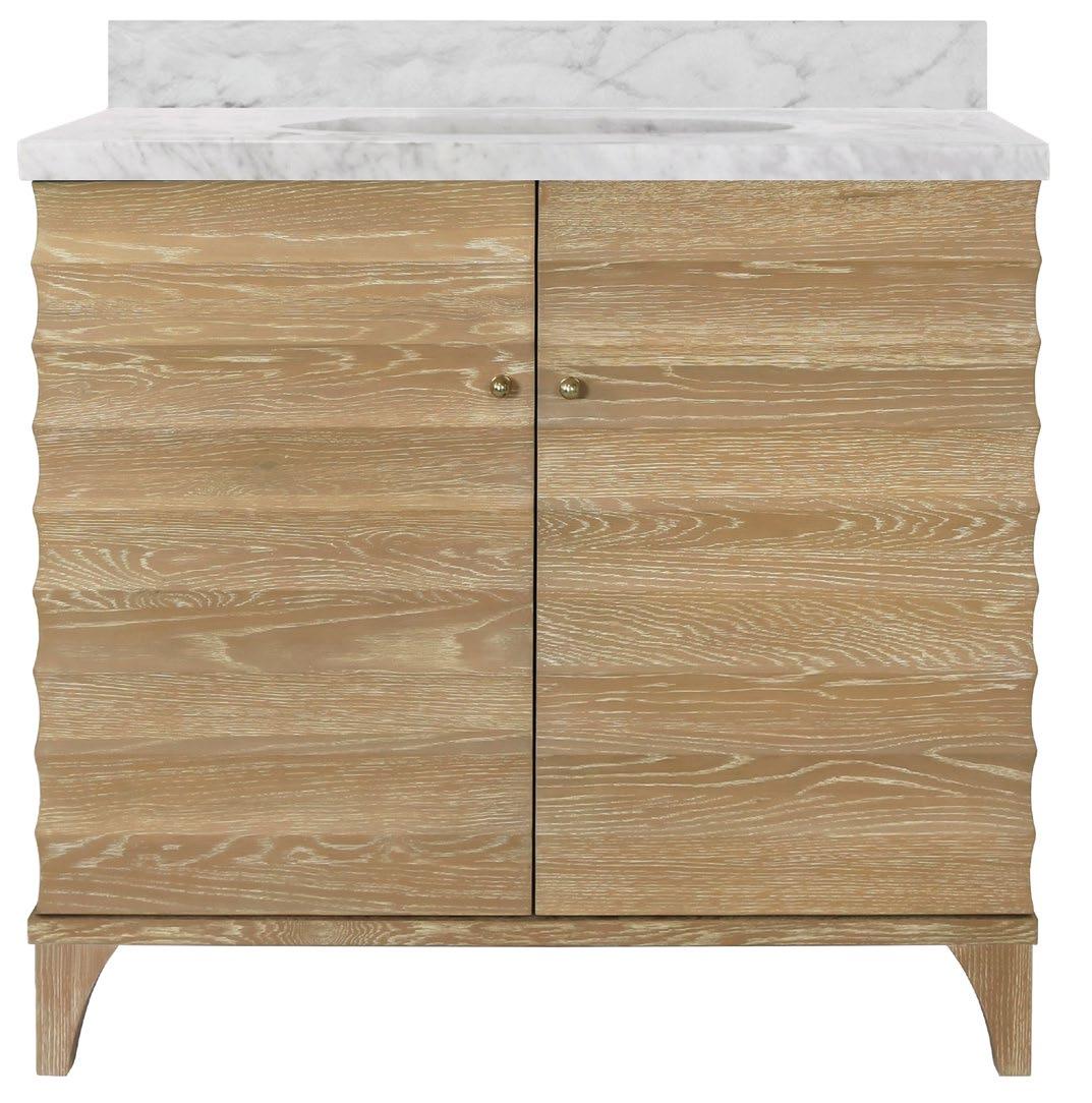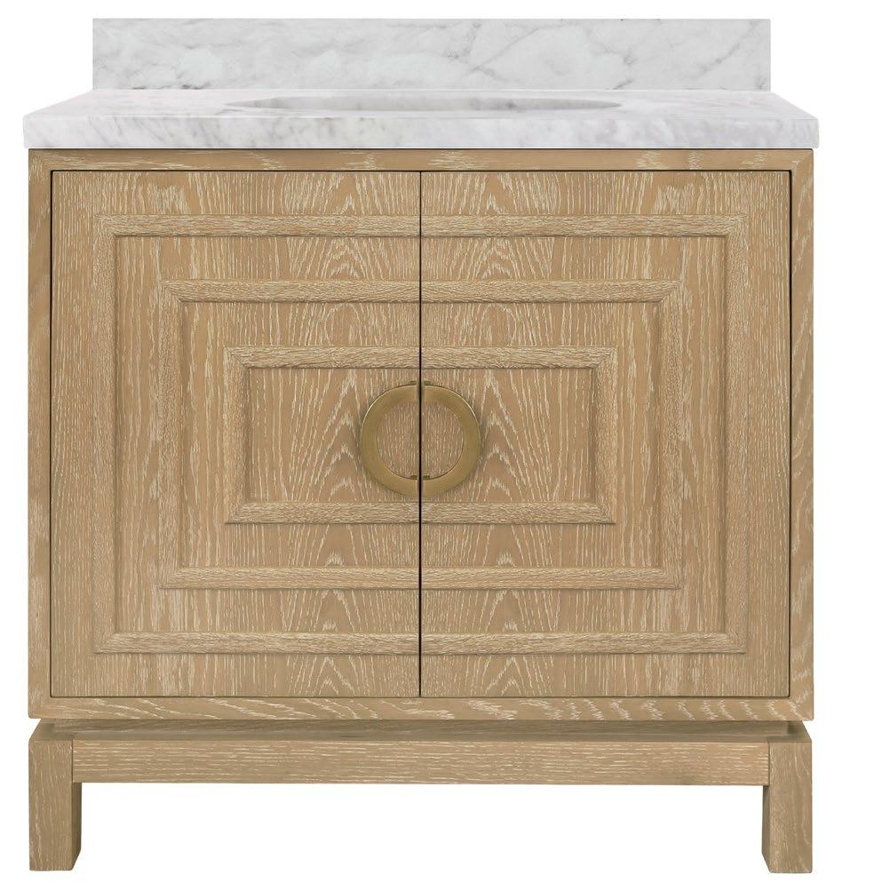 Offering both Ancient Greek details and an organic finish, the Odin CO will transform your bath or powder room into a haven! Employ the polished brass knobs to gently open and experience the smooth functionality of the soft-close feature on each of the two working drawers. Crowning the natural cerused oak base is a white and grey Carrara marble top and backsplash seamlessly integrated with an attached white porcelain sink basin.