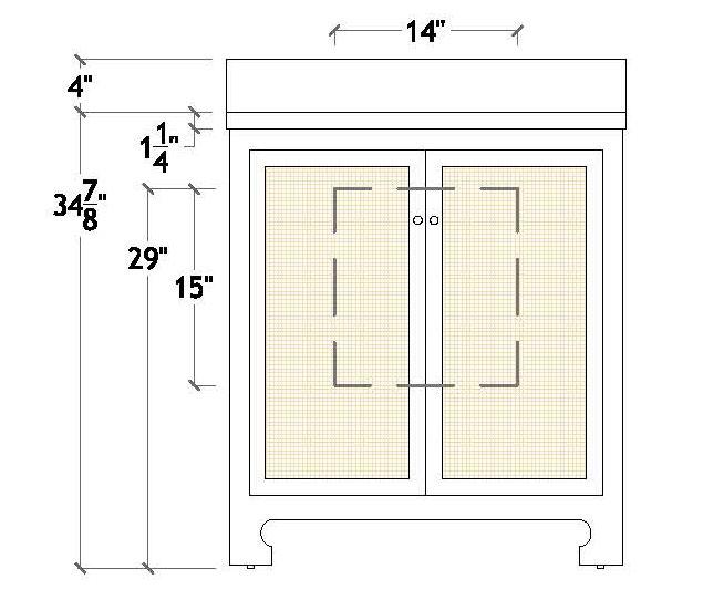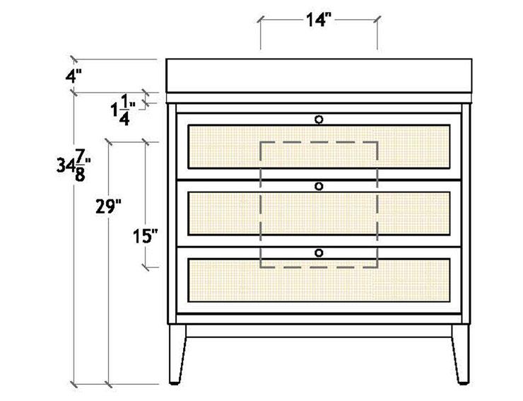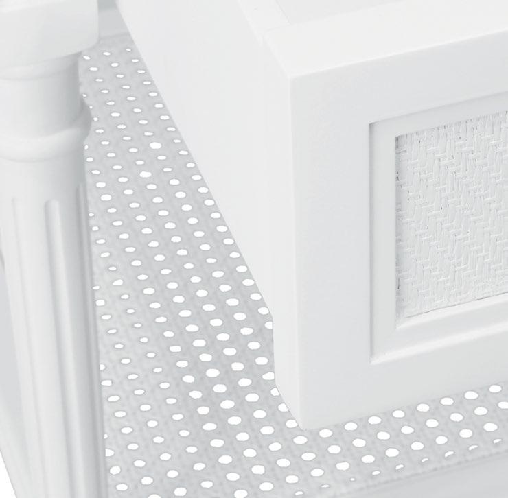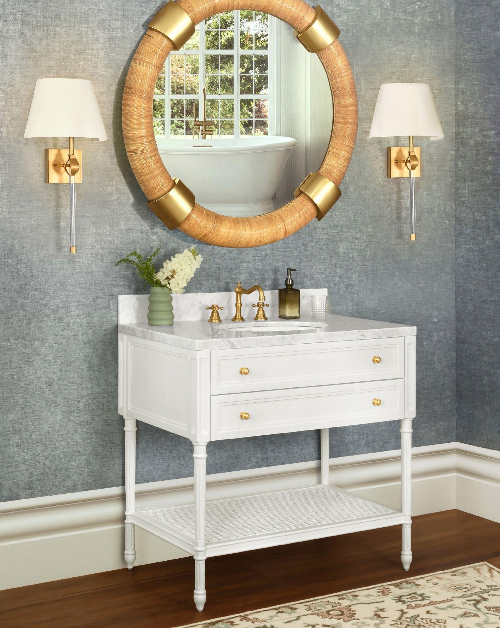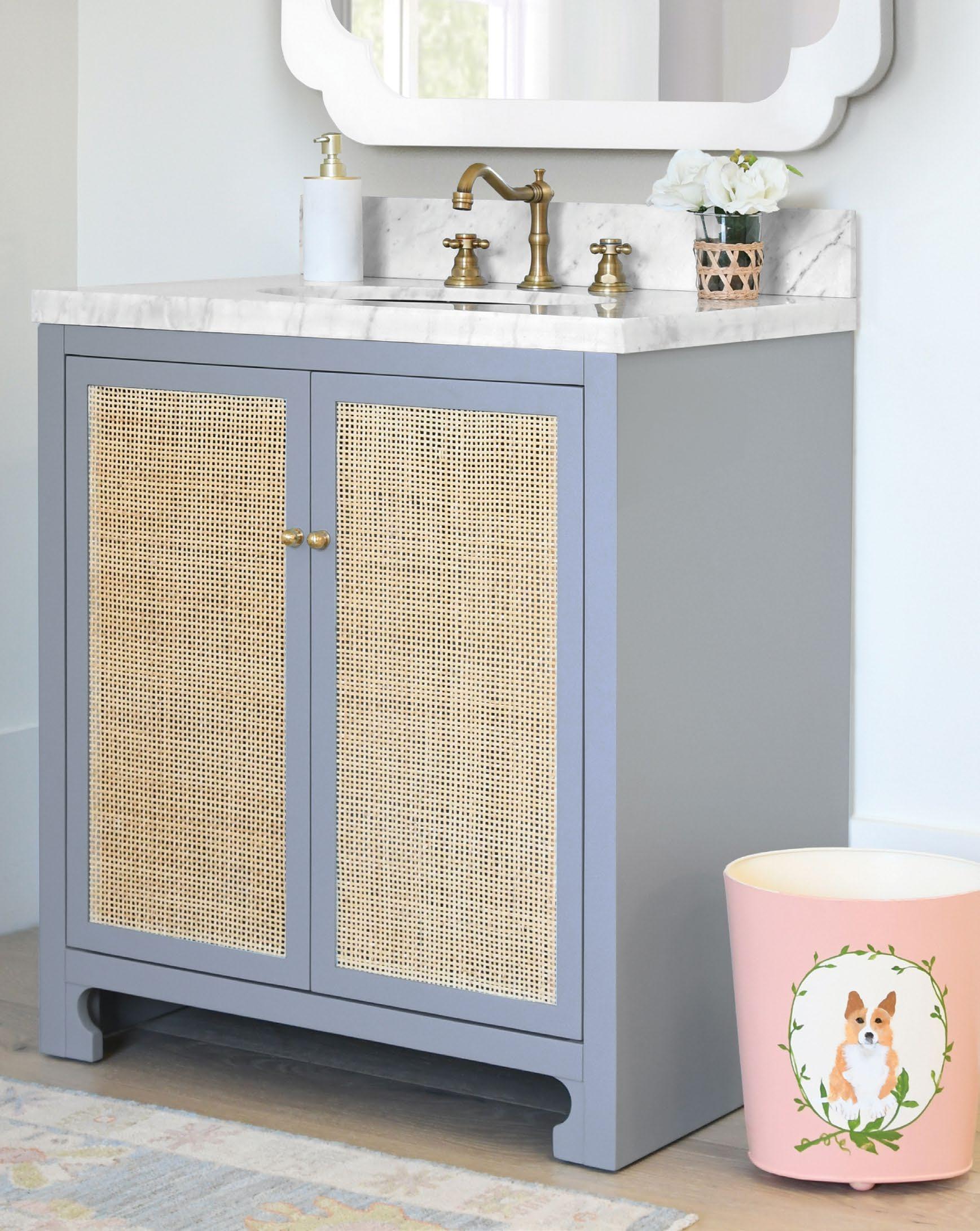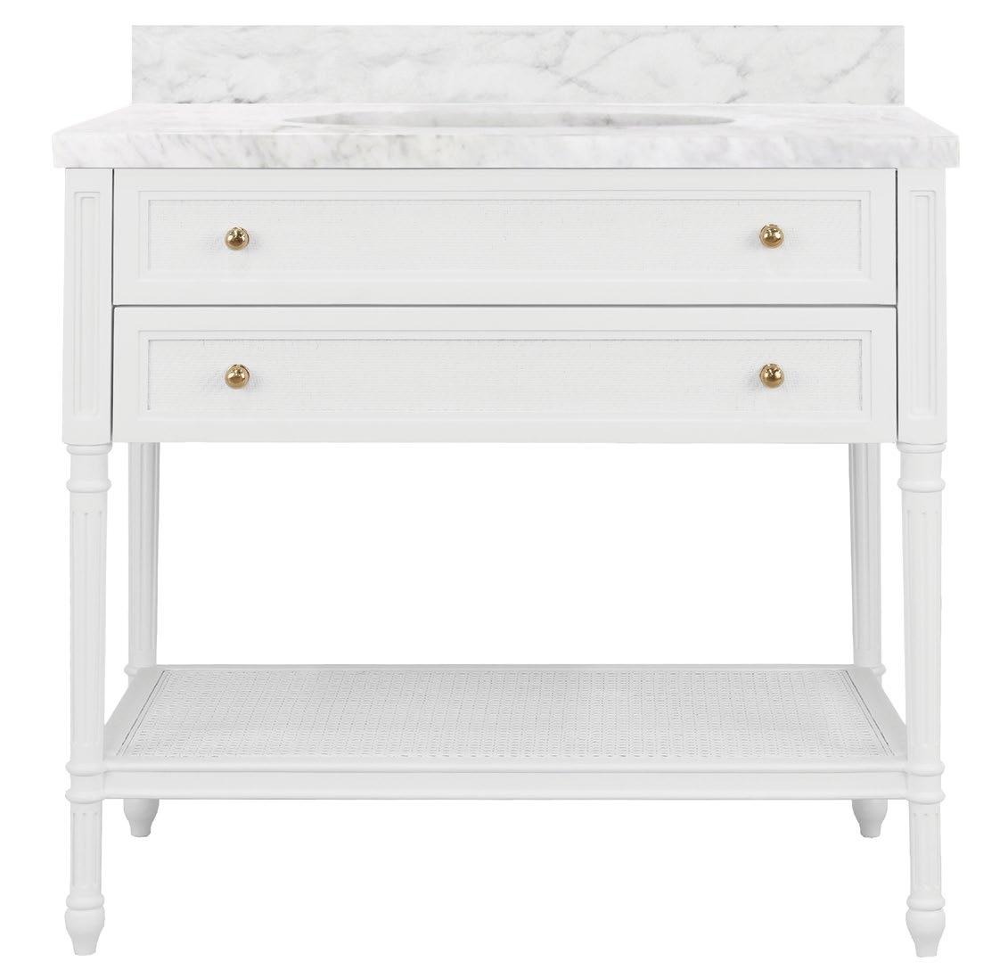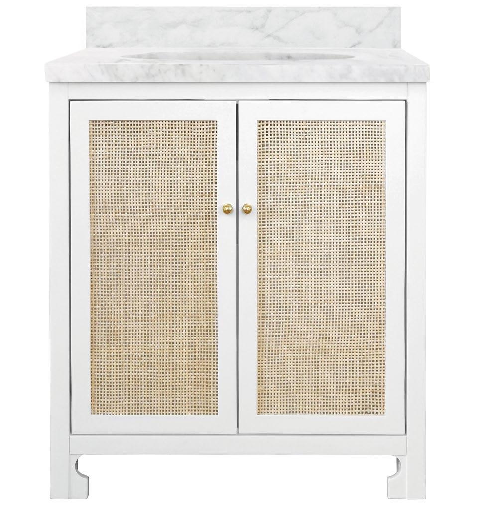 Meet the Martha bath vanity! Its matte white lacquer finish is beautifully enhanced by the painted grasscloth detail, adding a touch of texture and sophistication. An open cane shelf, fluted legs, and brass ball hardware complete the look along with a white and grey Carrara marble top and backsplash plus a white porcelain sink , making Martha a stunning blend of romance and timeless charm.