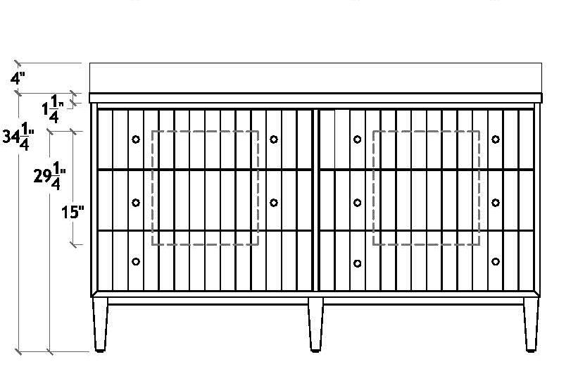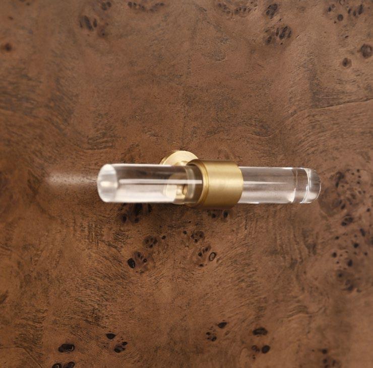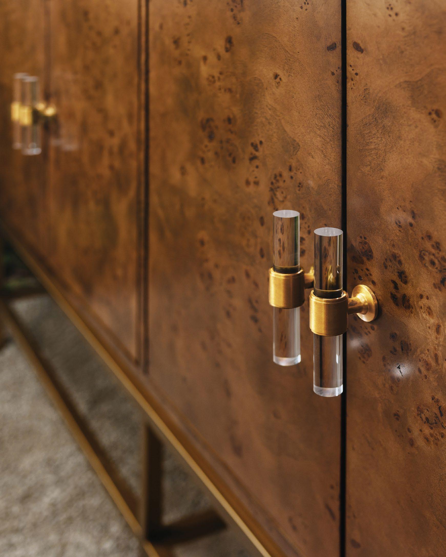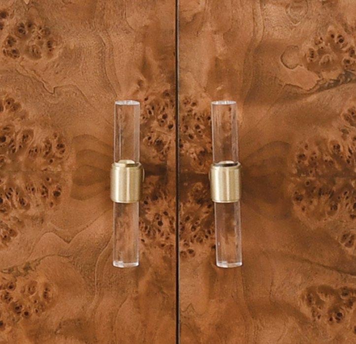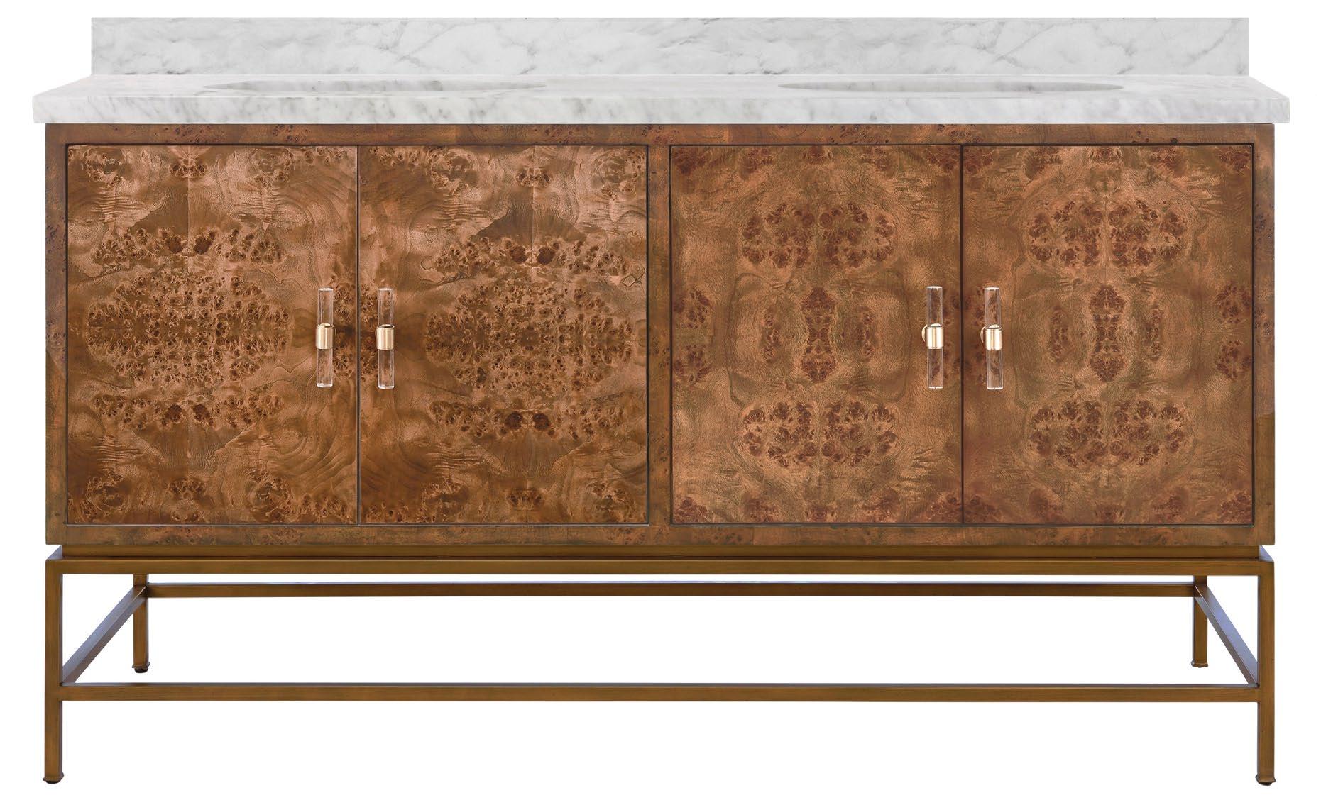 Amp up your powder room with our extraordinary Clifford 60 DBW double bath vanity. This Mid Century mod stunner features dark burl wood cabinets with lucite & antique brass door pulls. The case floats atop a sturdy, antique brass metal base and includes a luminous white and grey Carrara marble top and backsplash, plus two white porcelain sinks.