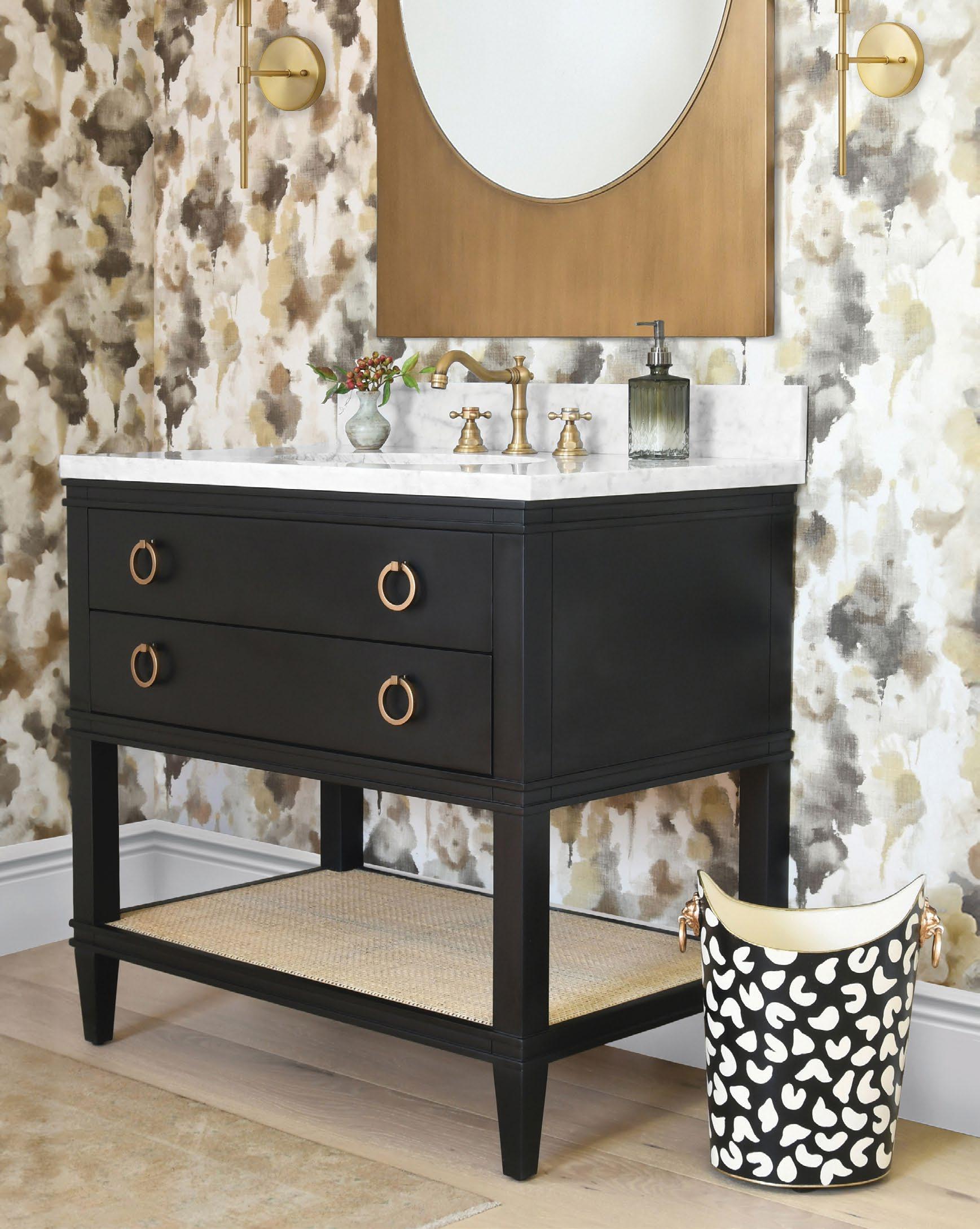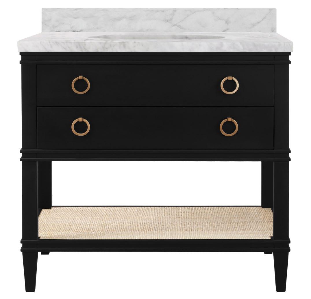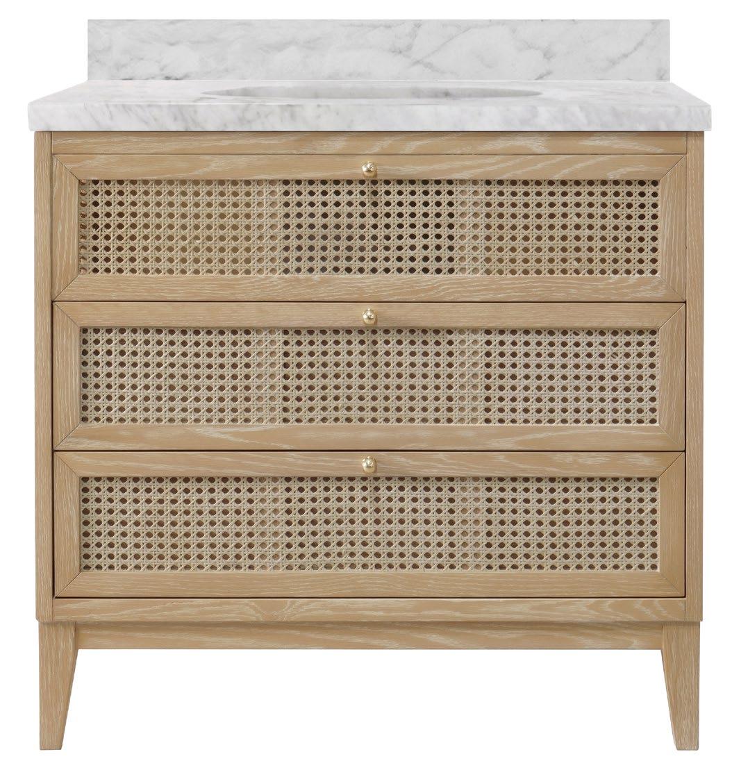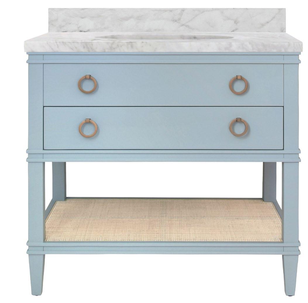 The Cutler bath vanity, in a matte light blue (LB), a matte black (BLK), or an organic cerused oak (CO) finish, is a celebration of craftsmanship and natural beauty. The Cutler’s emphasis on a seamless user experience is enhanced by the incorporation of a soft-close drawer glide and antique brass ring hardware. Finished with a timeless handwoven cane shelf, it showcases a white and grey Carrara marble top and backsplash plus an installed white porcelain sink.