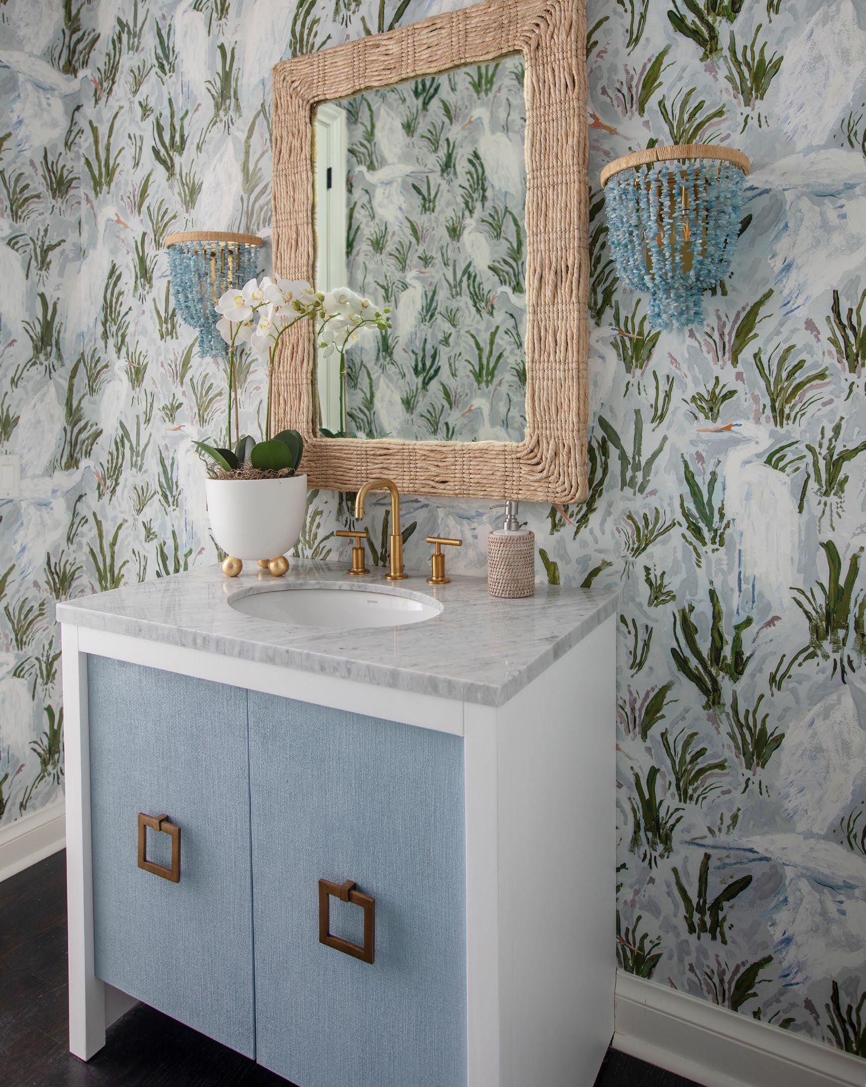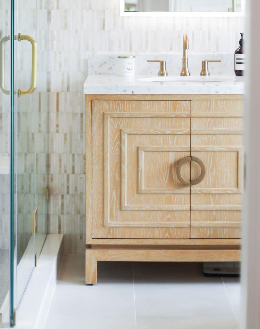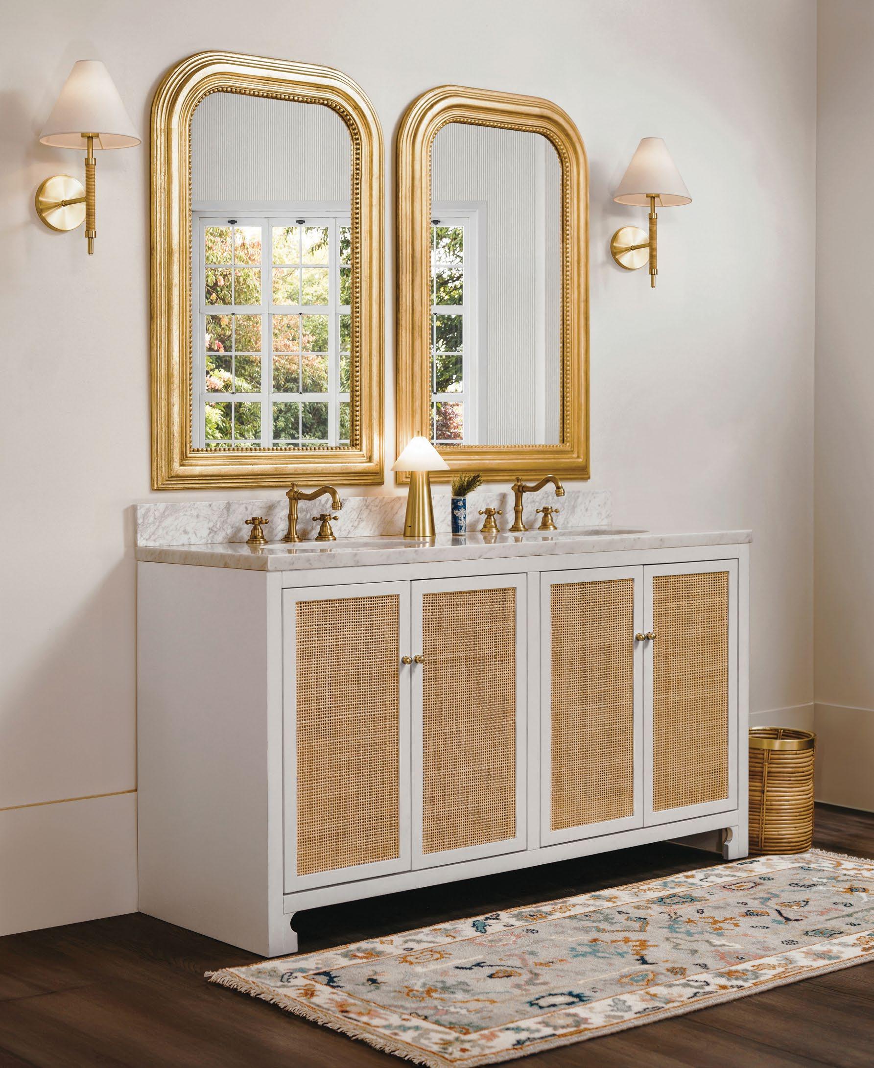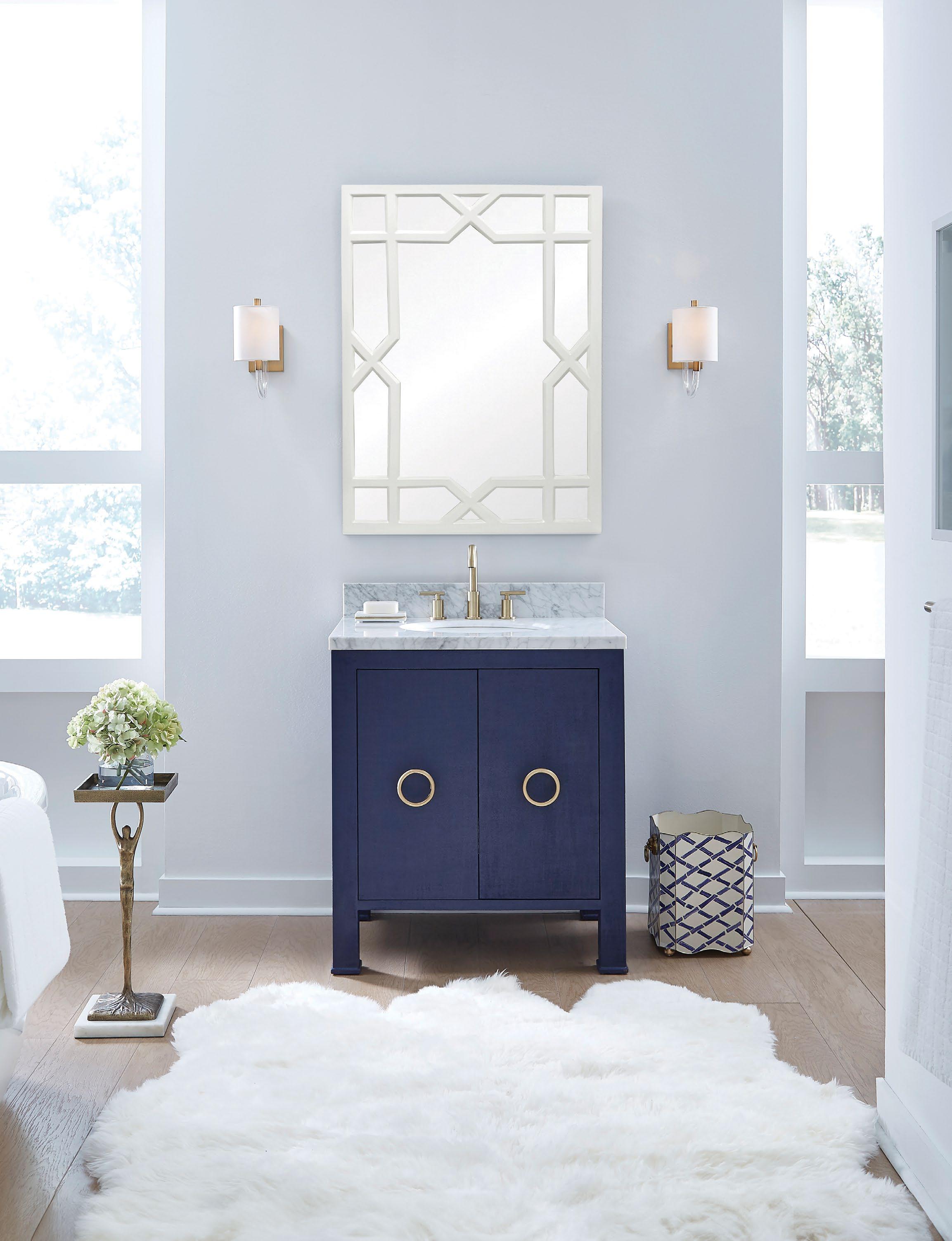 The Cutler bath vanity, in a matte light blue (LB), a matte black (BLK), or an organic cerused oak (CO) finish, is a celebration of craftsmanship and natural beauty. The Cutler’s emphasis on a seamless user experience is enhanced by the incorporation of a soft-close drawer glide and antique brass ring hardware. Finished with a timeless handwoven cane shelf, it showcases a white and grey Carrara marble top and backsplash plus an installed white porcelain sink.