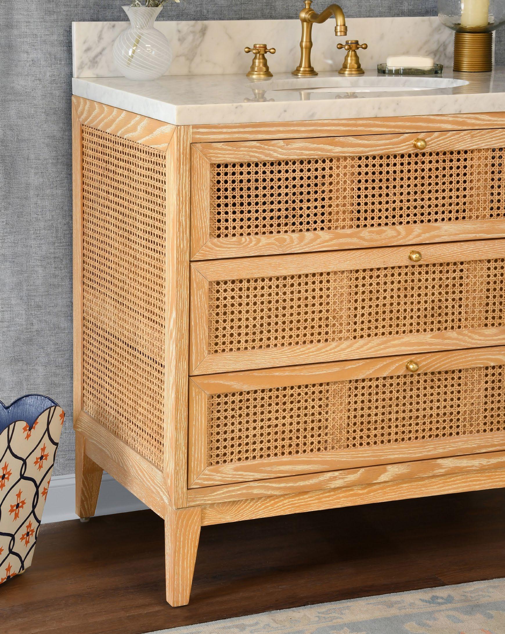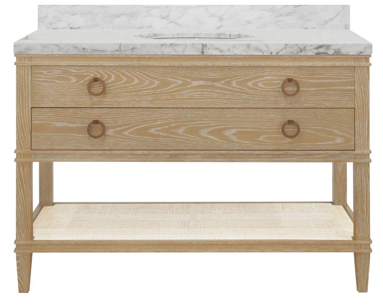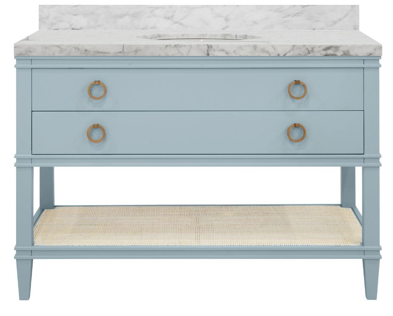 The Cutler 48 bath vanity, in an organic cerused oak (CO) or matte light blue (LB) finish, is a celebration of craftsmanship and natural beauty. The Cutler 48’s emphasis on a seamless user experience is enhanced by the incorporation of a soft-close drawer glide and antique brass ring hardware. Finished with a timeless handwoven cane shelf, it showcases a white and grey Carrara marble top and backsplash plus an installed white porcelain sink.