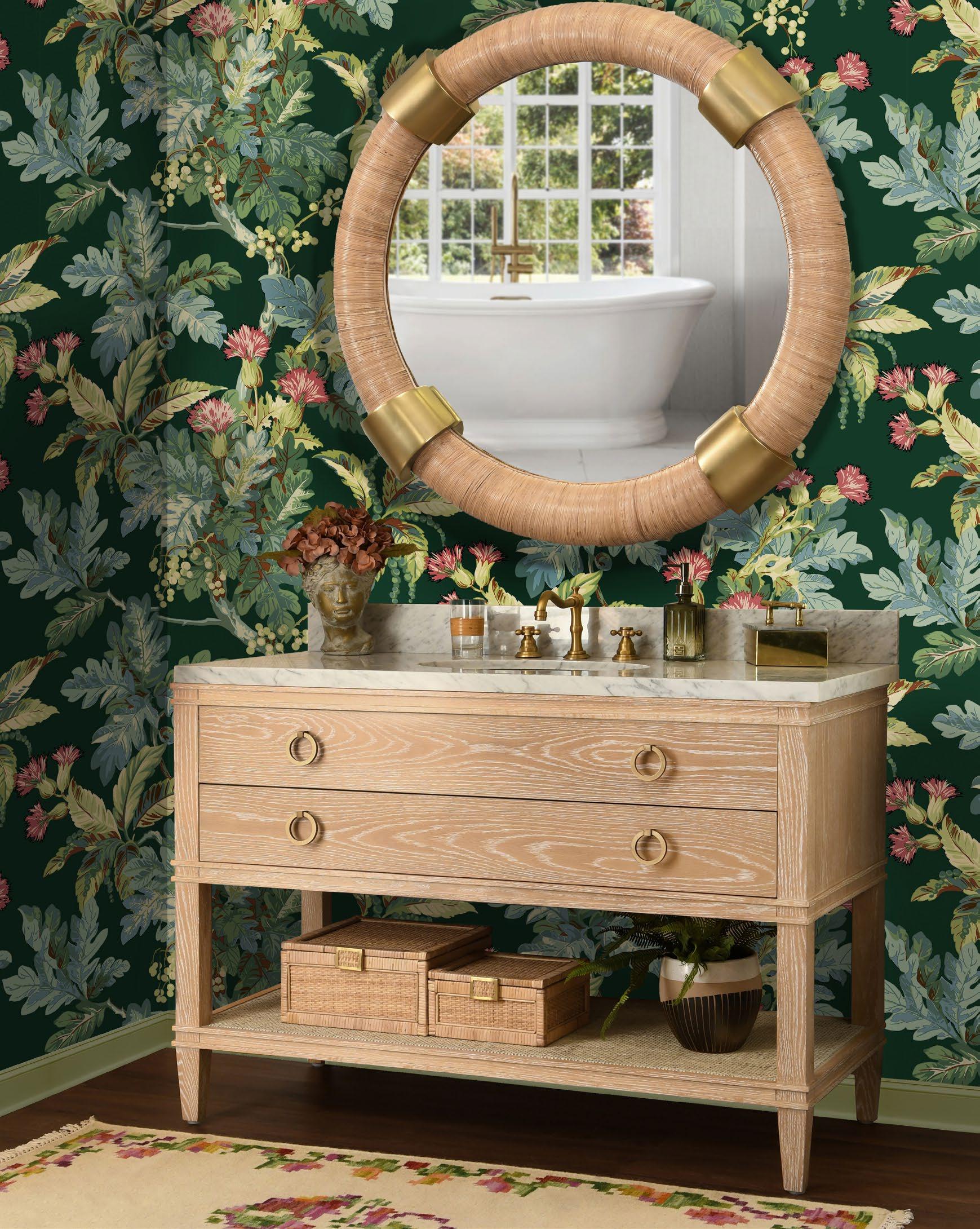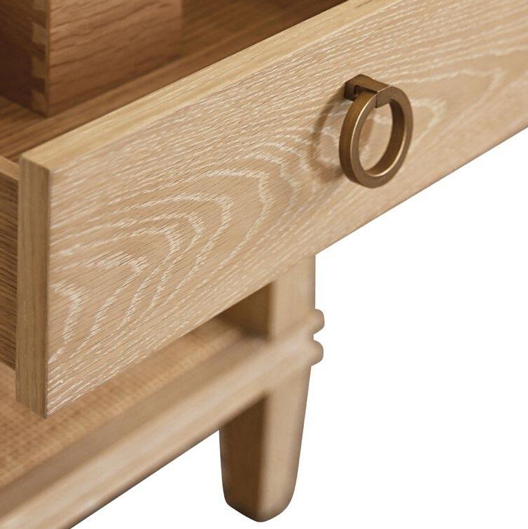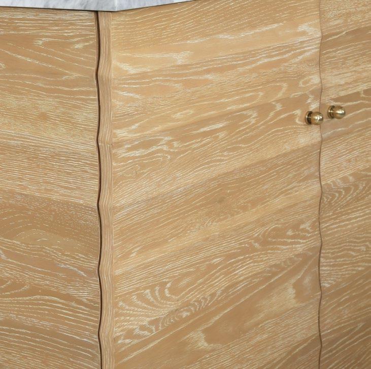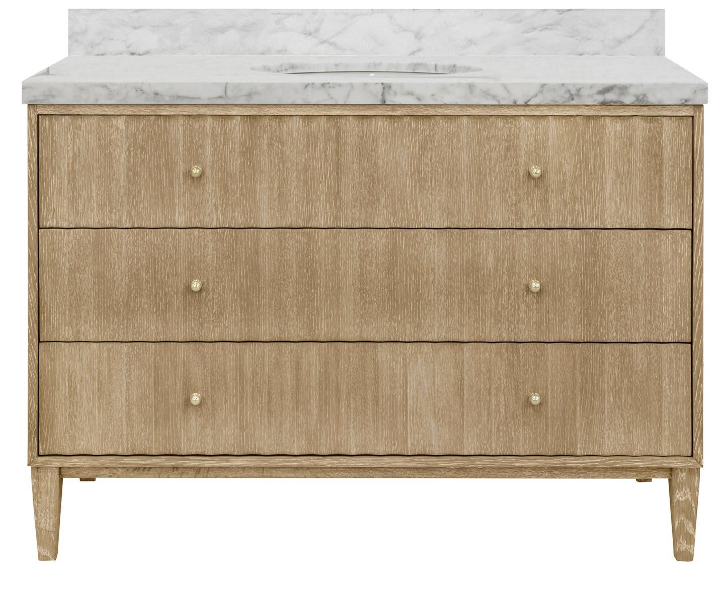 The Cutler 48 bath vanity, in an organic cerused oak (CO) or matte light blue (LB) finish, is a celebration of craftsmanship and natural beauty. The Cutler 48’s emphasis on a seamless user experience is enhanced by the incorporation of a soft-close drawer glide and antique brass ring hardware. Finished with a timeless handwoven cane shelf, it showcases a white and grey Carrara marble top and backsplash plus an installed white porcelain sink.