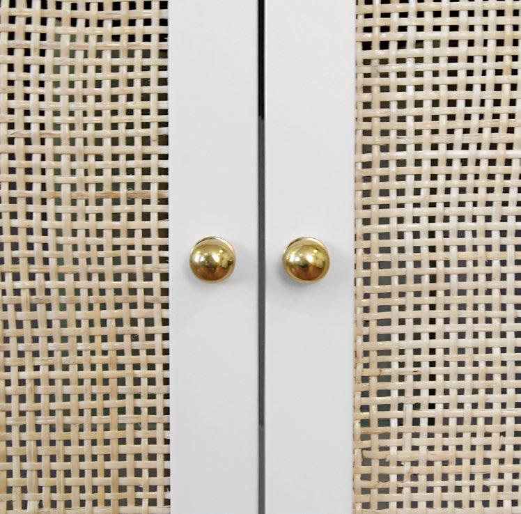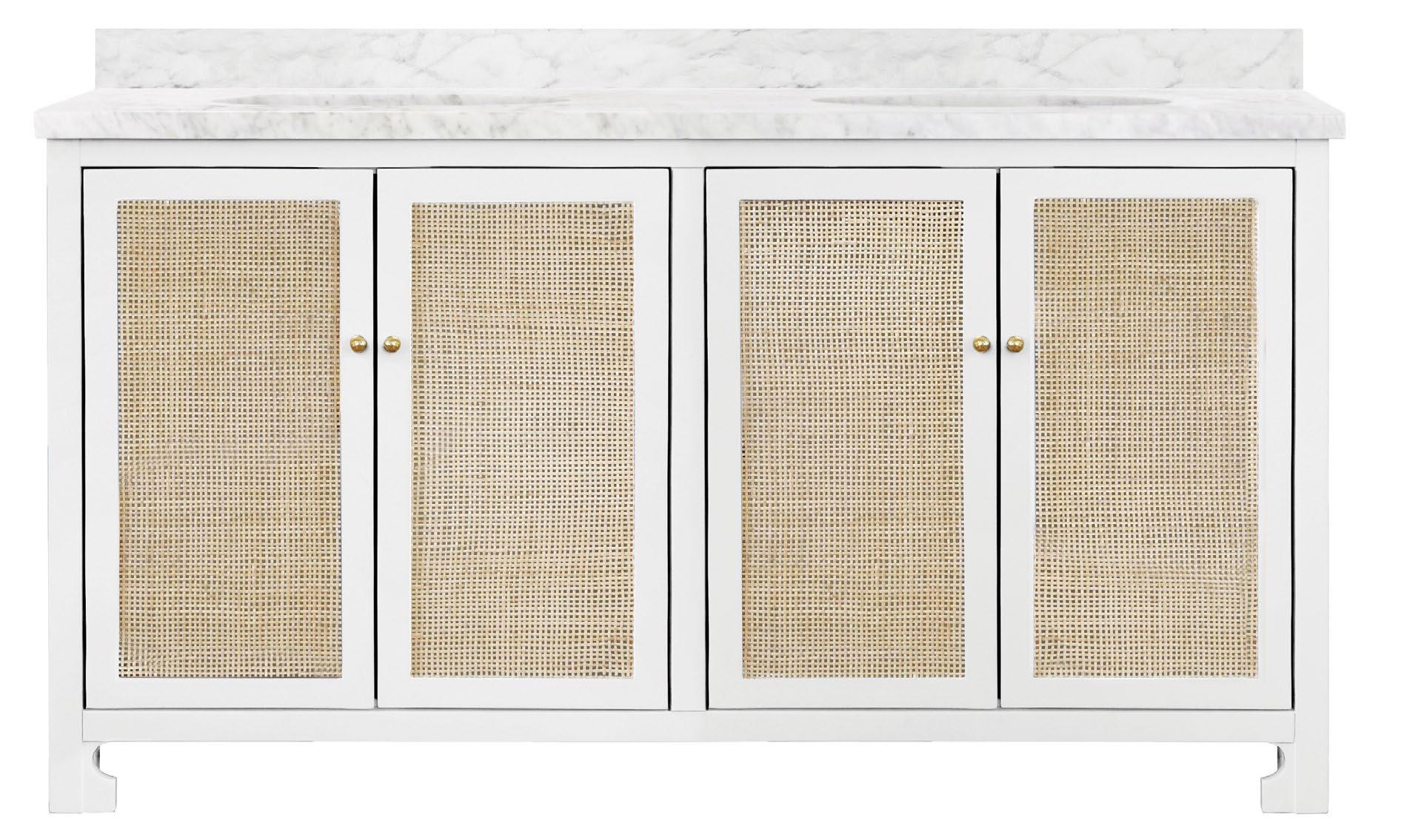 With its bright and airy aesthetic, our Boyd 60 WH double vanity brings understated luxury to your Mid Century, Farmhouse or Scandinavian-inspired bathroom. Simple and refined, the natural cane door fronts are encased in matte white lacquer with brass knob hardware. Included are a white and grey Carrara marble top and backsplash plus two white porcelain sinks.