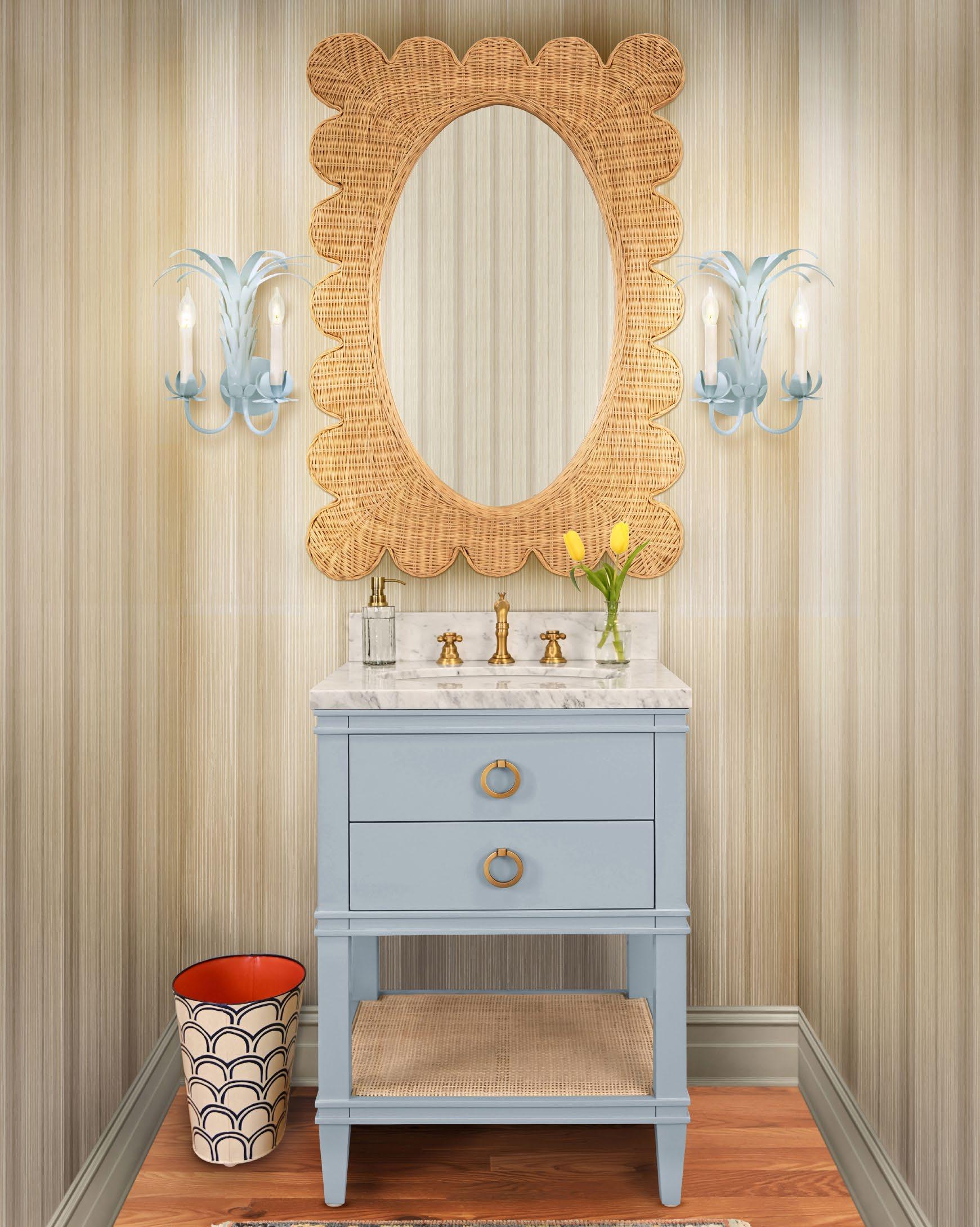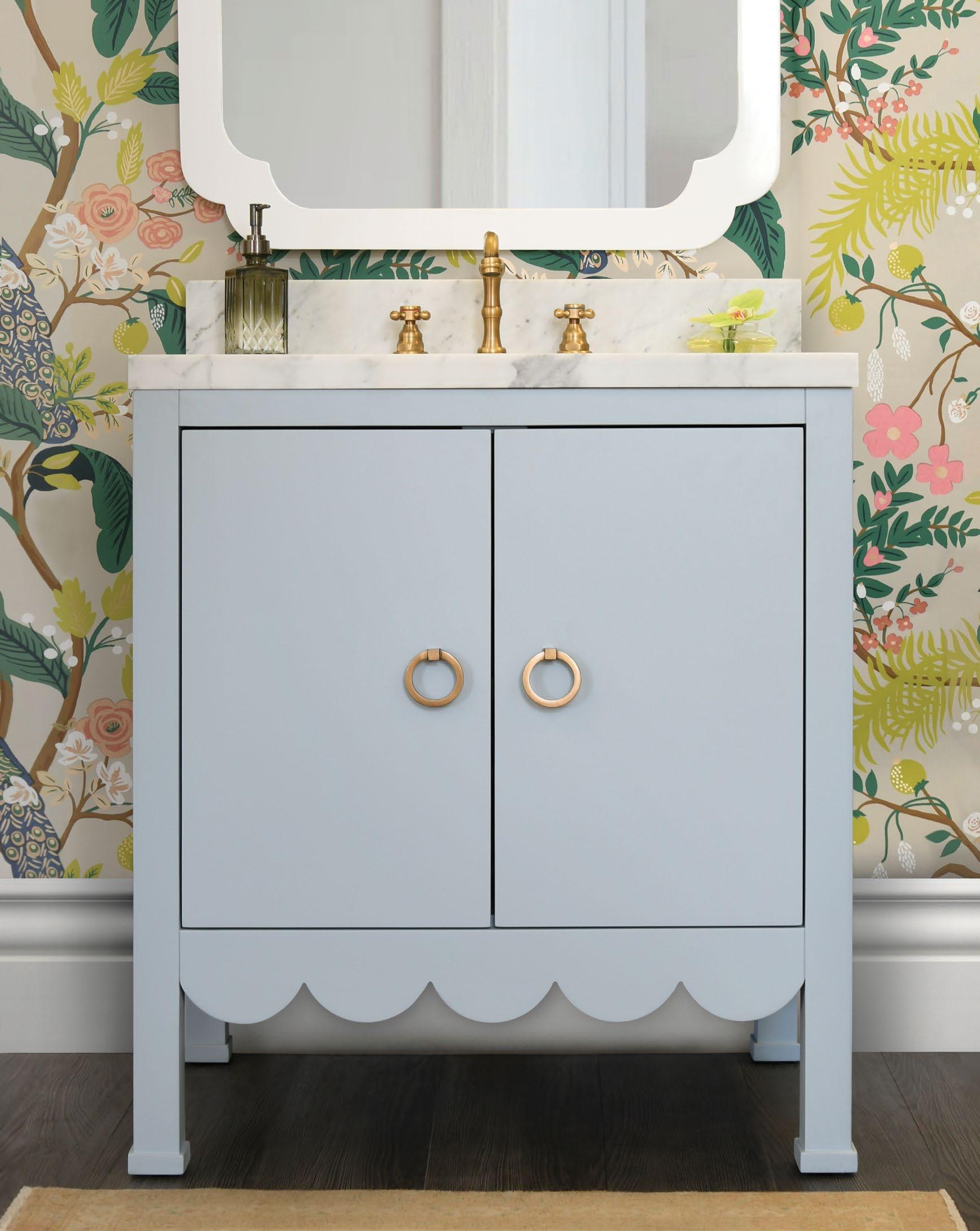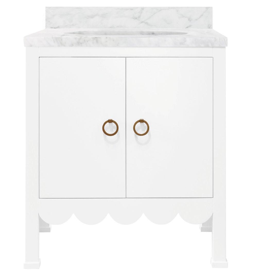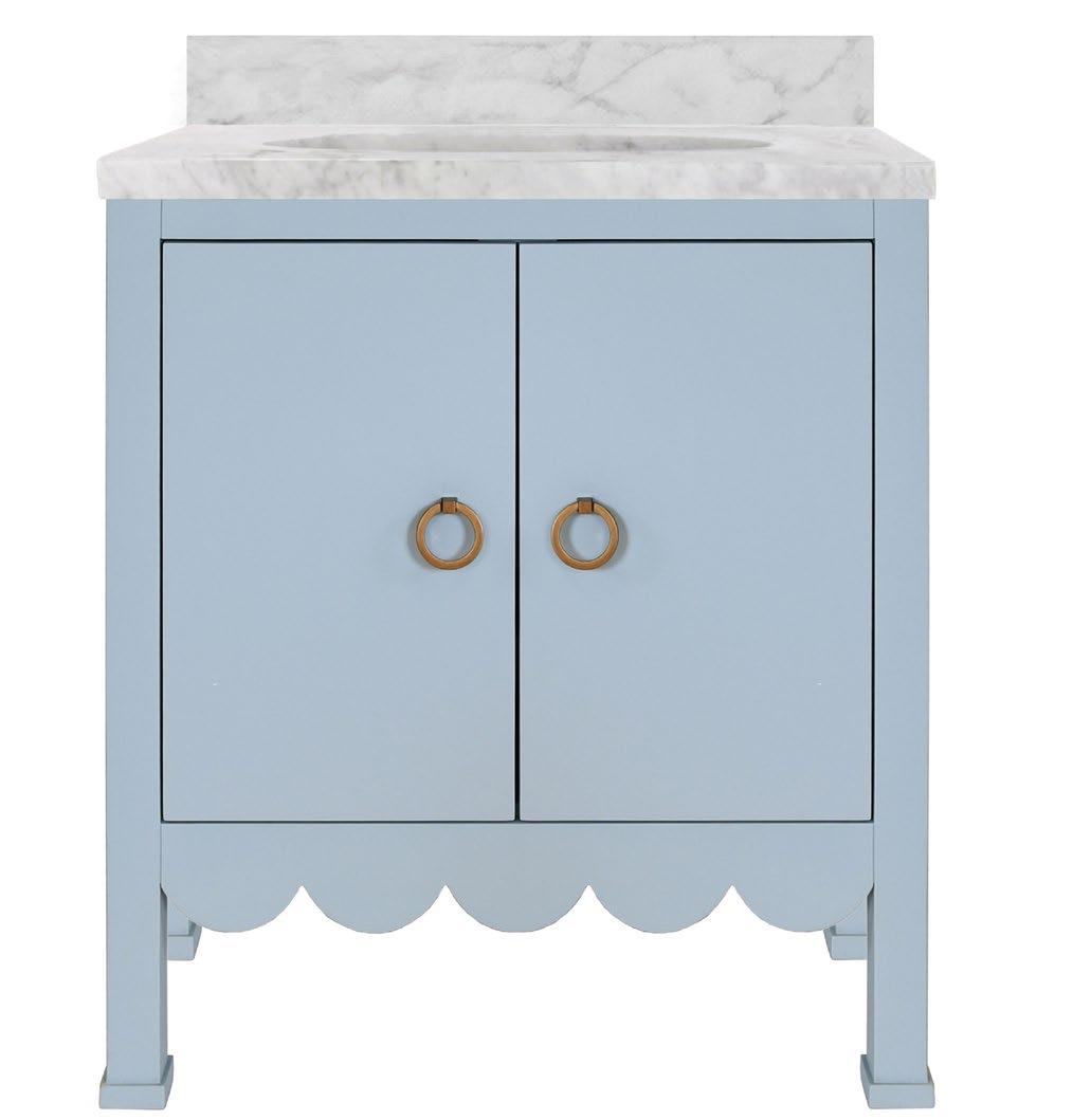 Embrace a sense of whimsy and sophistication with the Kealey bath vanity in a crisp matte light blue lacquer (LB) or matte white lacquer (WH) finish. Adorned with a delightful scallop detail that adds a playful charm to its design, the Kealey exudes a joyful aesthetic. Topping off the base is a white and grey Carrara marble top and backsplash, white porcelain sink, and satin brass ring hardware.