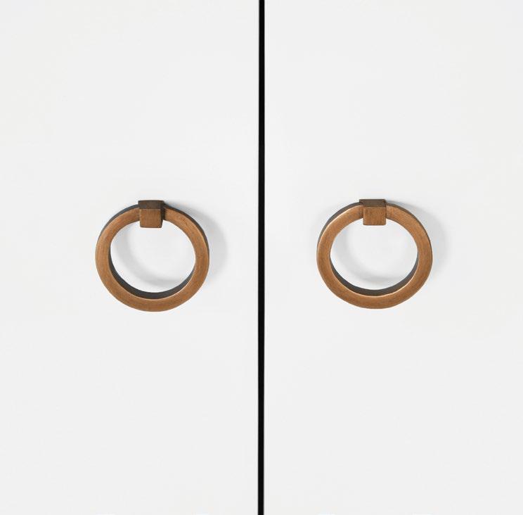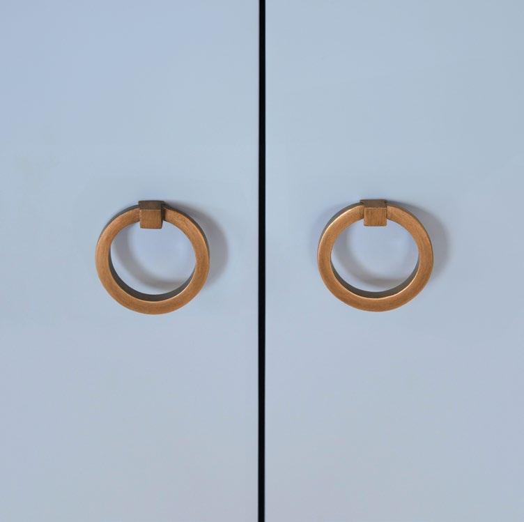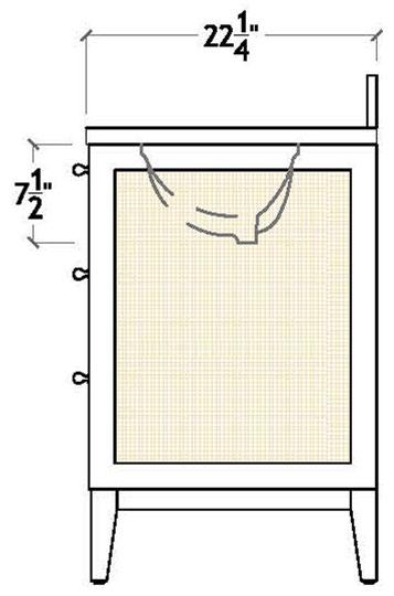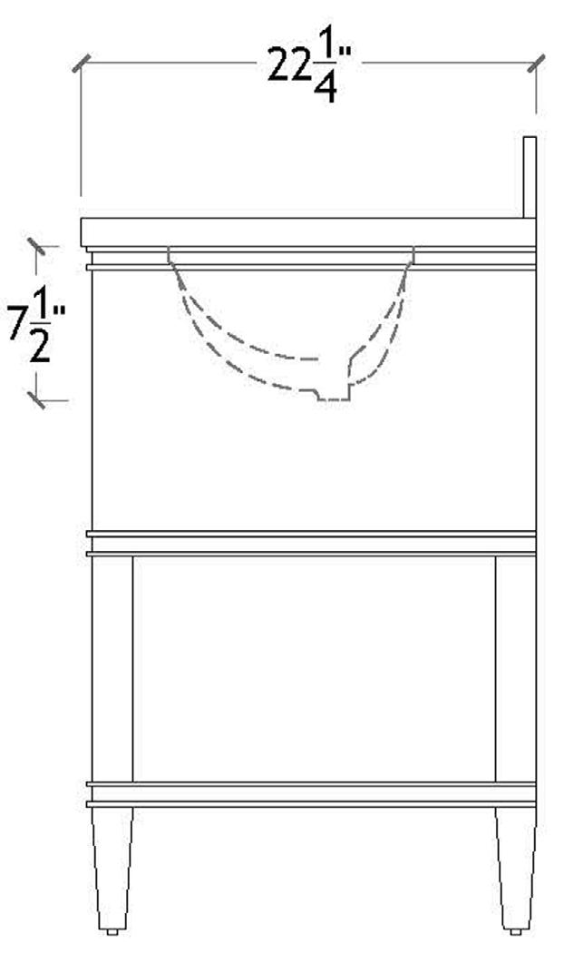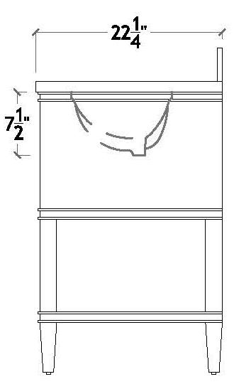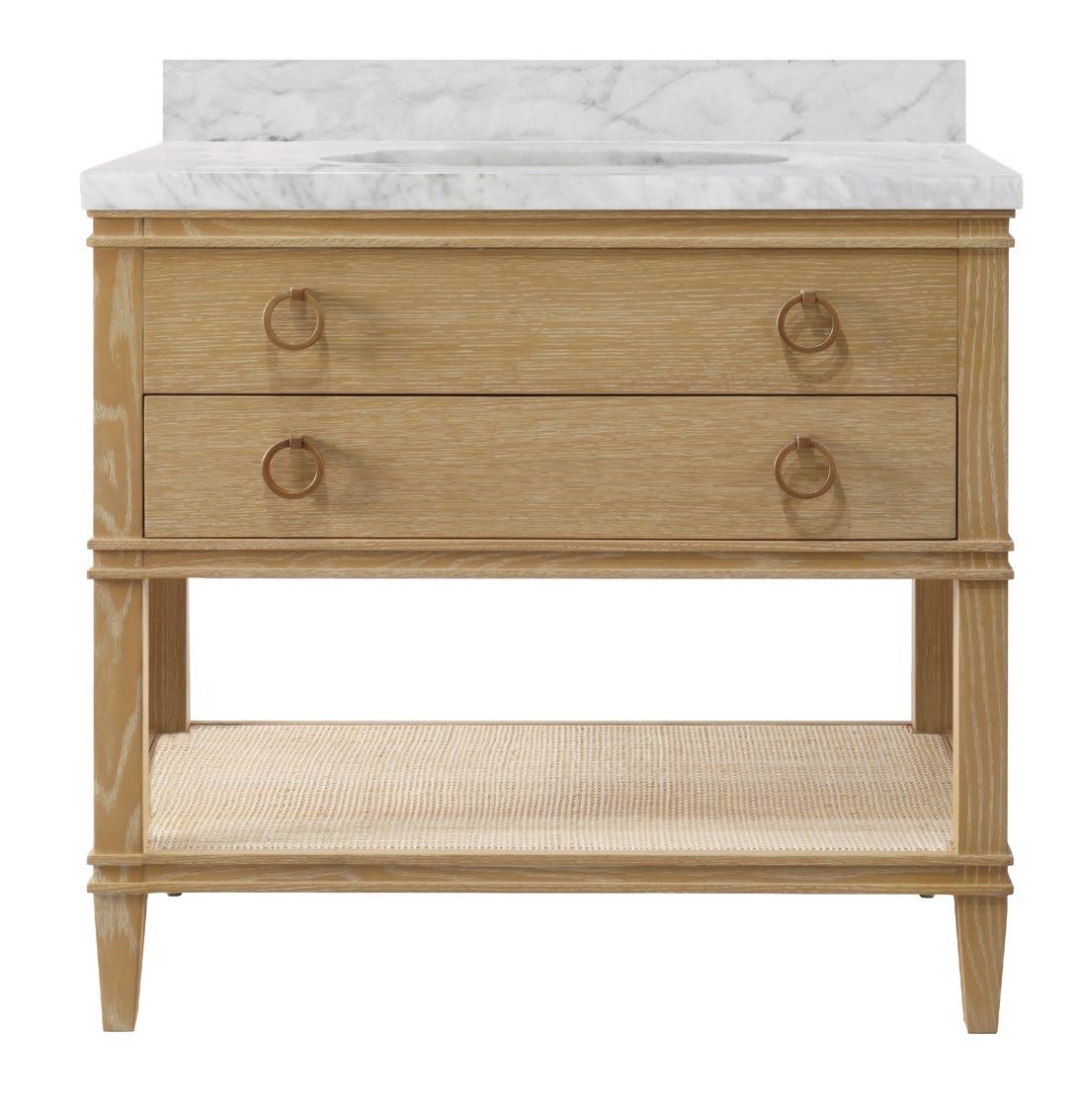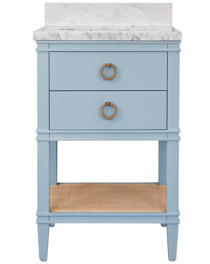 The Cutler 24 bath vanity, in an organic cerused oak (CO) or matte light blue (LB) finish, is a celebration of craftsmanship and natural beauty. The Cutler 24’s emphasis on a seamless user experience is enhanced by the incorporation of a soft-close drawer glide and antique brass ring hardware. Finished with a timeless handwoven cane shelf, it showcases a white and grey Carrara marble top and backsplash plus an installed white porcelain sink.