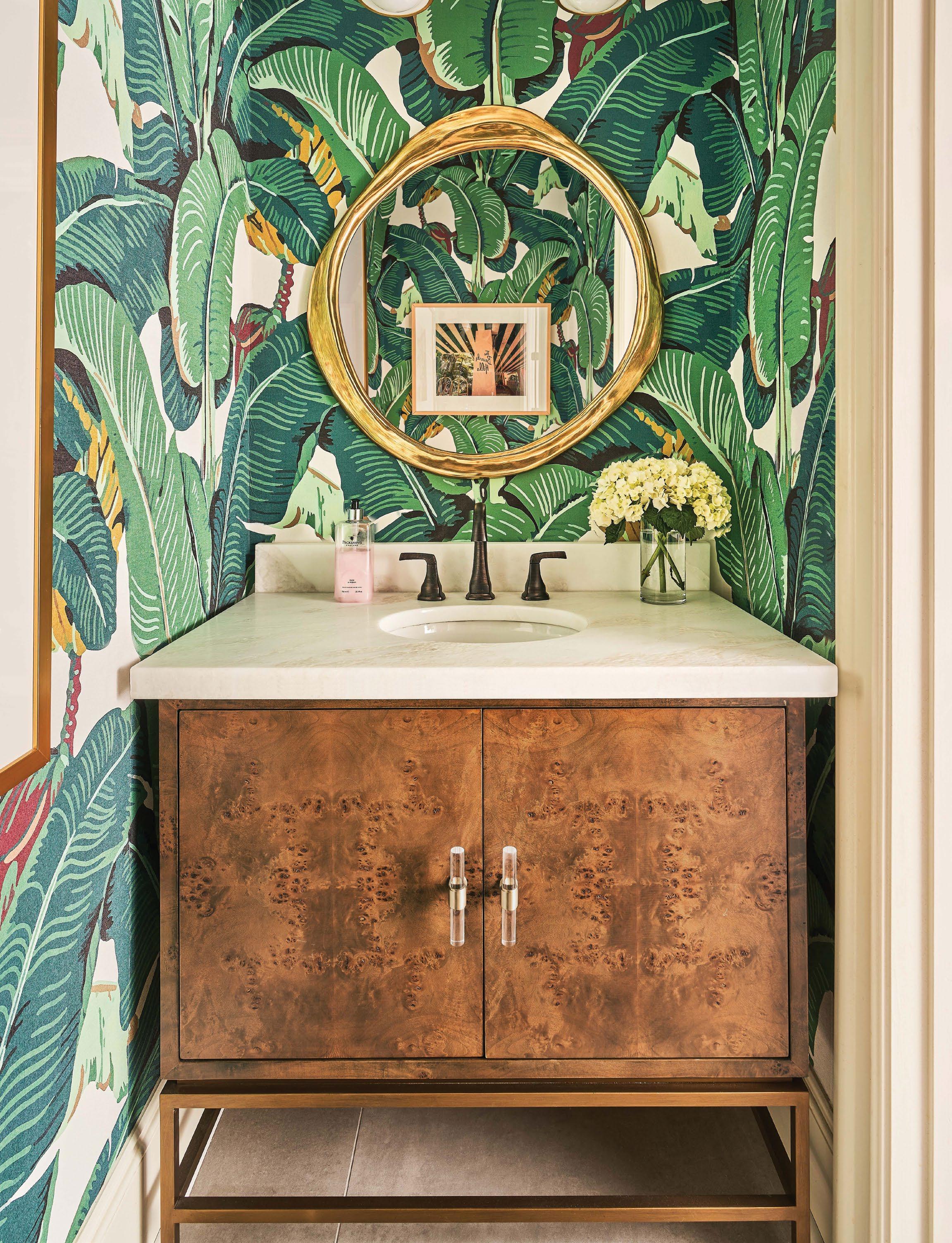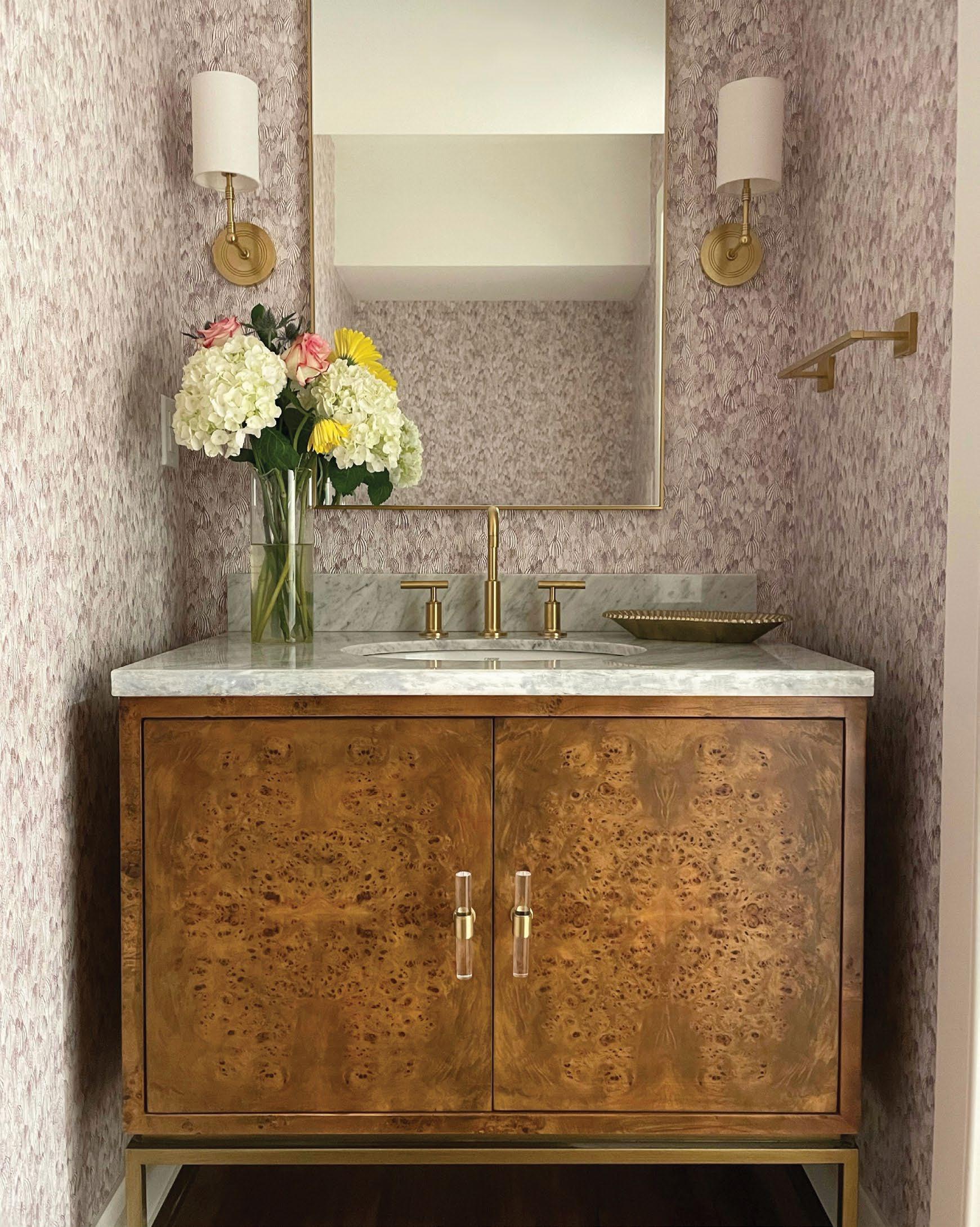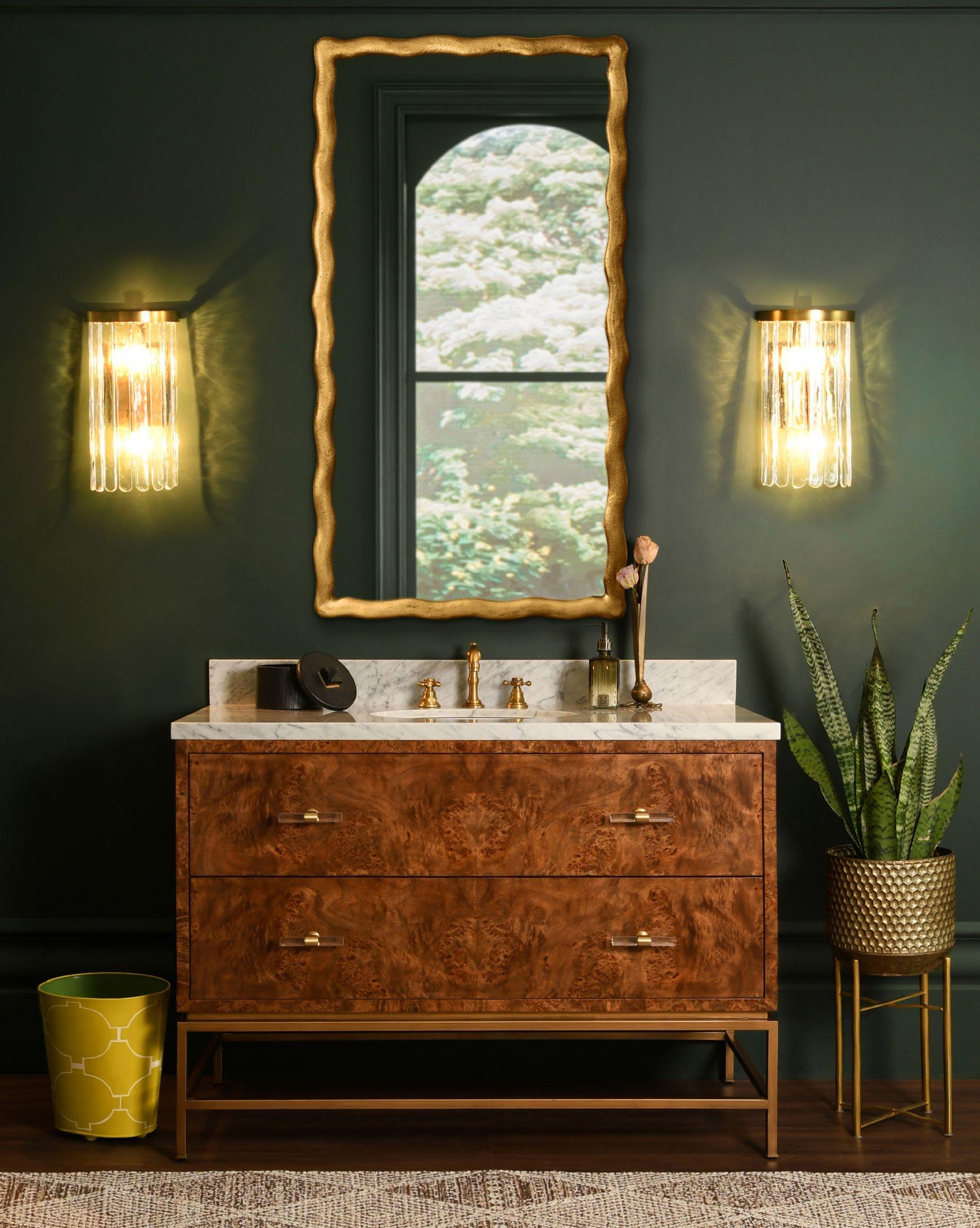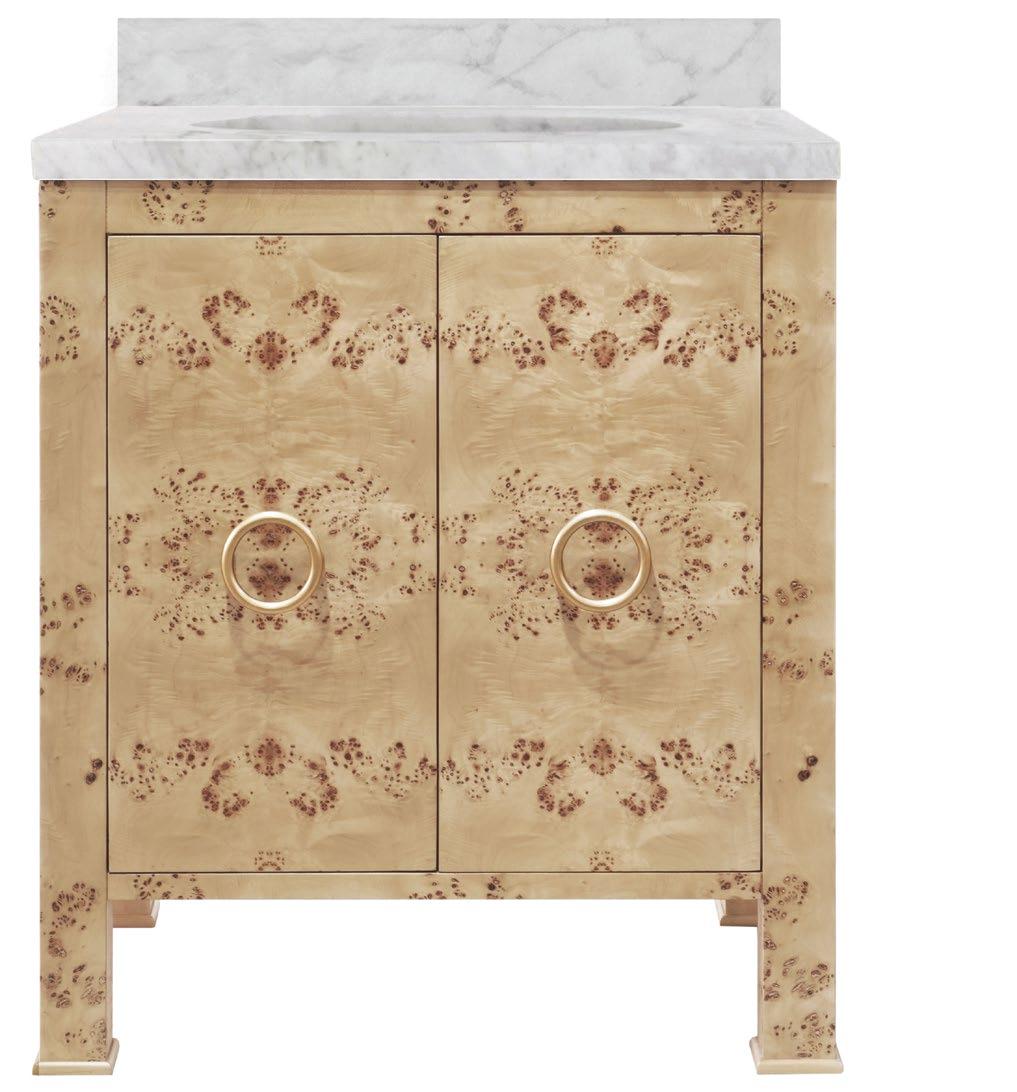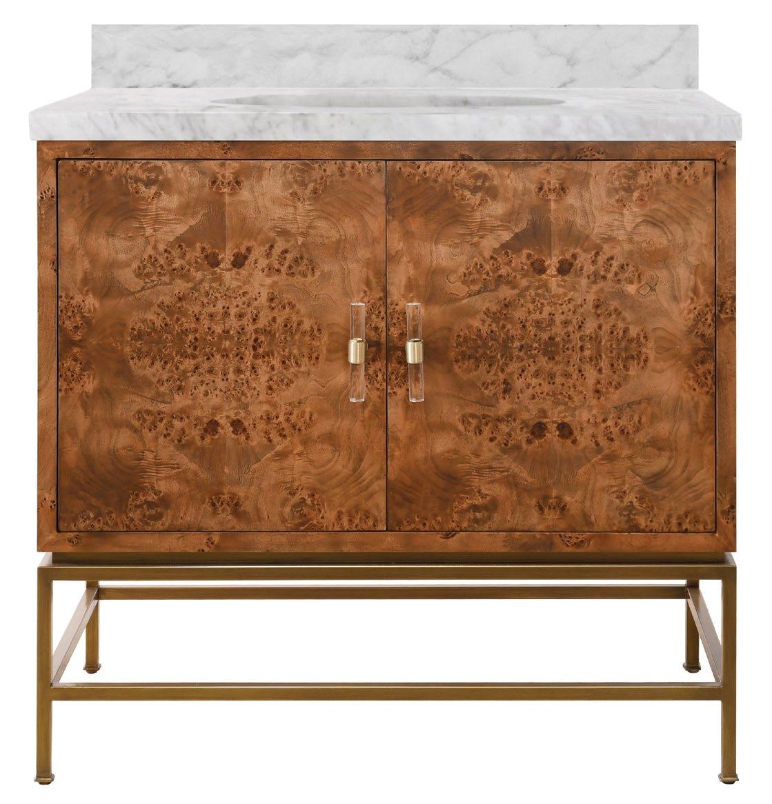 Amp up your powder room with our extraordinary Clifford DBW bath vanity. This Mid Century mod stunner features a dark burl wood cabinet with lucite & antique brass door pulls. The case floats atop a sturdy, antique brass metal base and includes a luminous white and grey Carrara marble top and backsplash, plus a white porcelain sink.