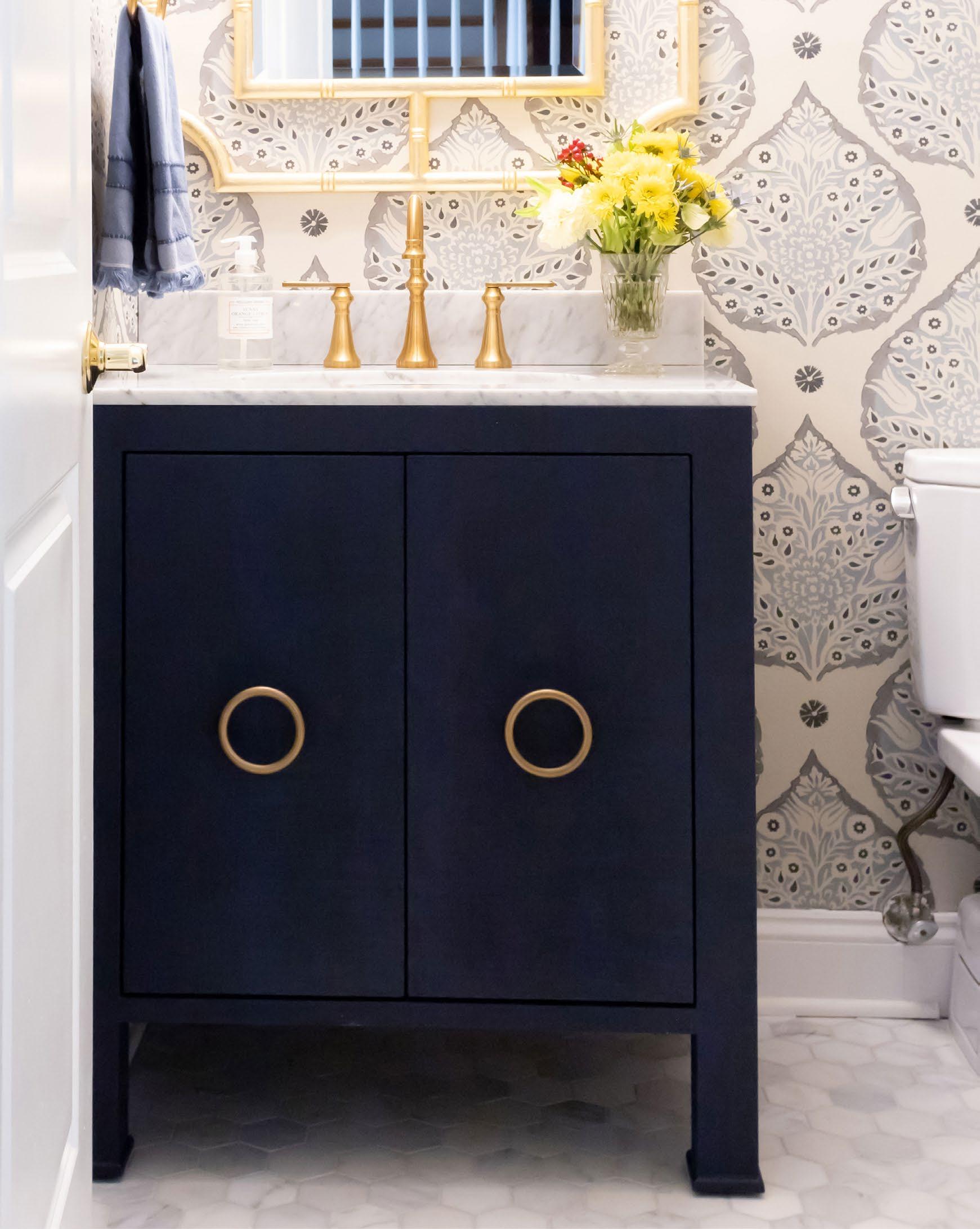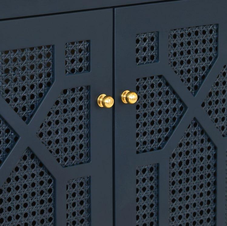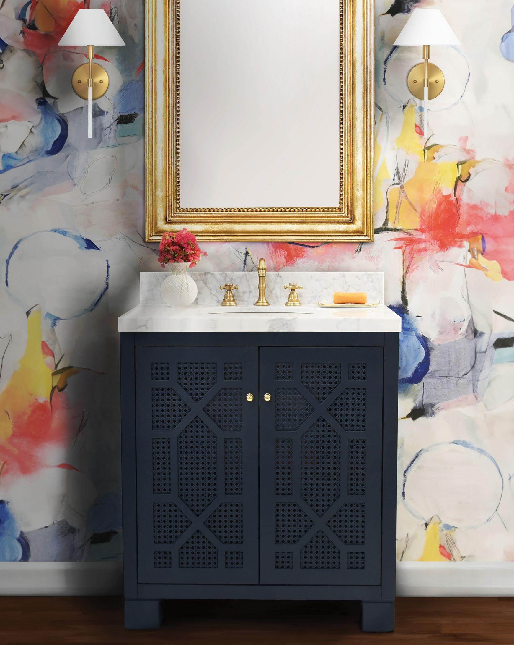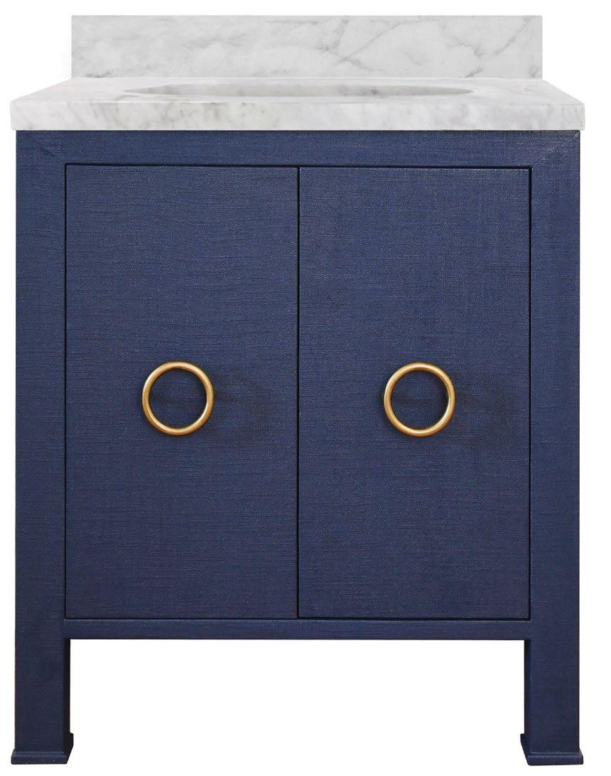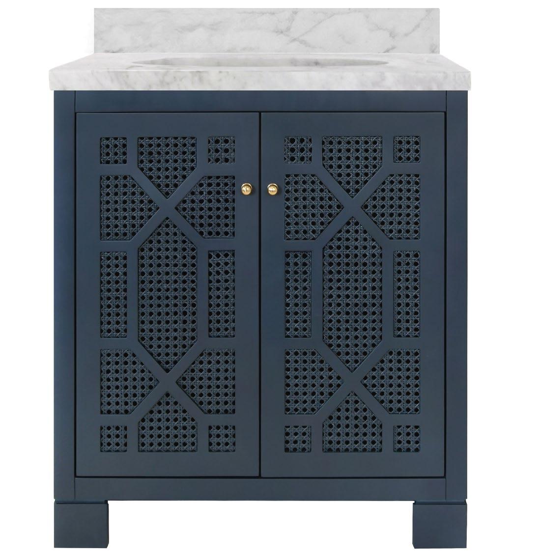 Celebrate sophistication and craftsmanship with the exquisite Schaffer NVY bath vanity. Finished in a matte navy lacquer, the vanity showcases handwoven cane door fronts, white and grey Carrara marble top and backsplash, white porcelain sink, and polished brass knobs. Each detail complements the other in a cohesive and refined way with the Schaffer vanity.
