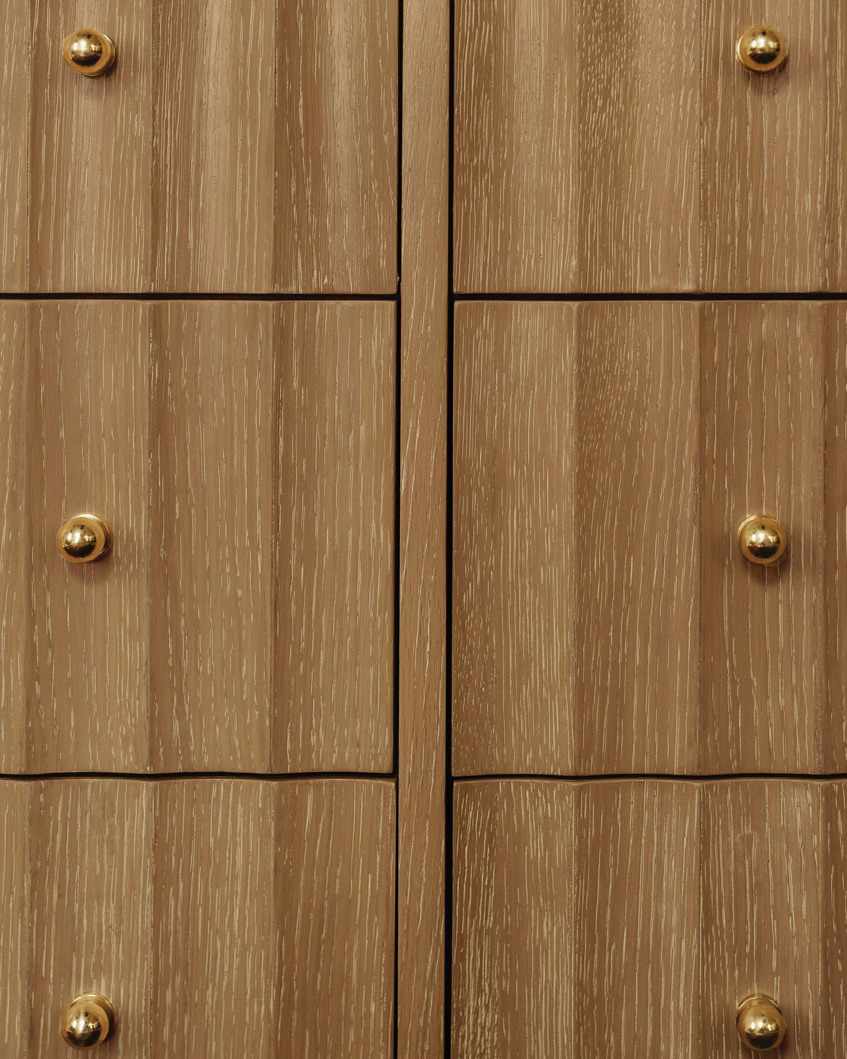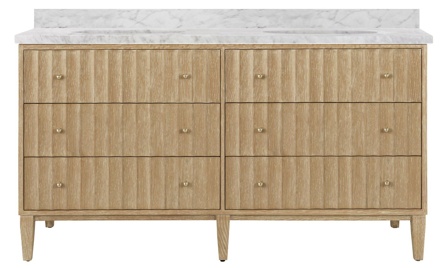 Offering both Ancient Greek details and an organic finish, the Odin 60 CO will transform your bath or powder room into a haven! Employ the polished brass knobs to gently open and experience the smooth functionality of the soft-close feature on each of the four working drawers. Crowning the natural cerused oak base is a white and grey Carrara marble top and backsplash seamlessly integrated with two attached white porcelain sinks.